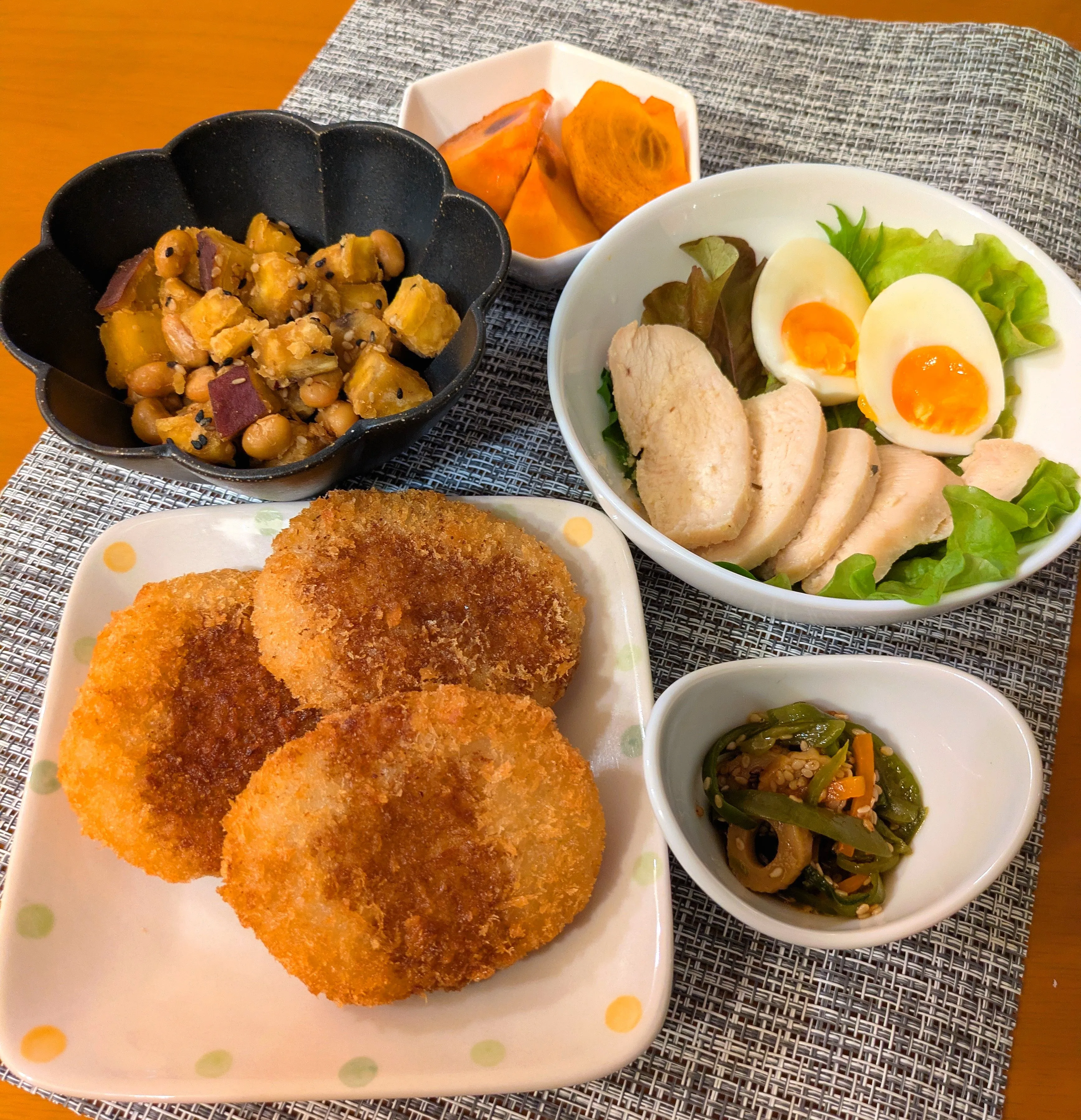 #夕食#コロッケ#サラダチキン#大豆#さつまいも#ピーマン#きんぴら#柿