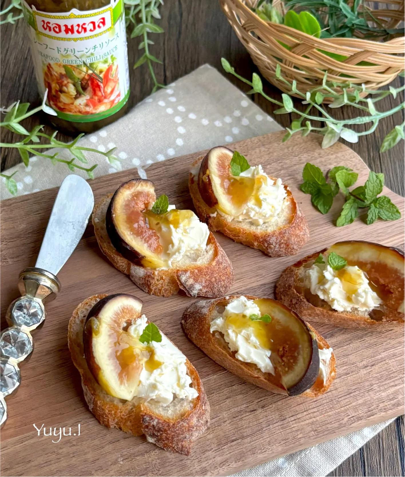 #タルティーヌ #バゲット #いちじく #イチジク #クリームチーズ #パン #おつまみ #グリーンチリソース #チリソース