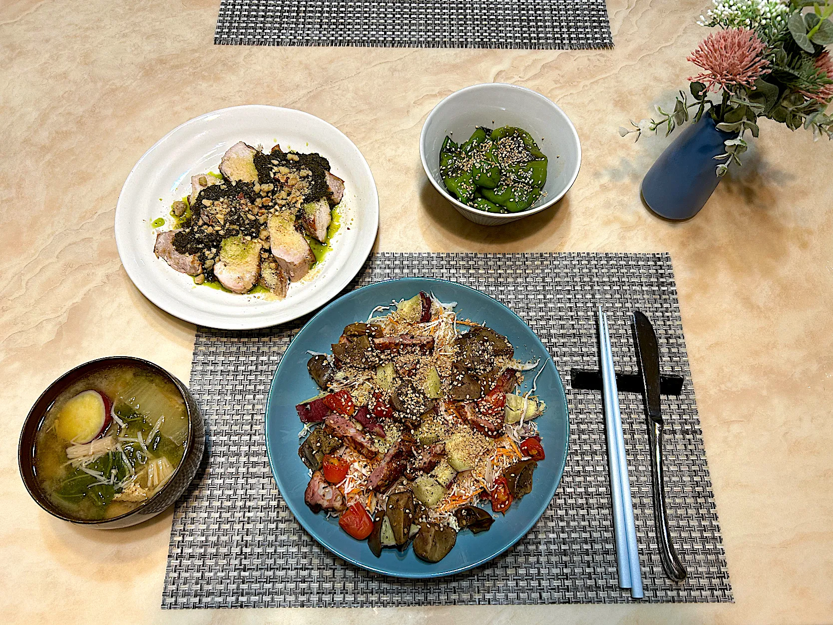 お夕飯 鰹のたたき・カボチャサラダ・厚揚げお好み焼き...