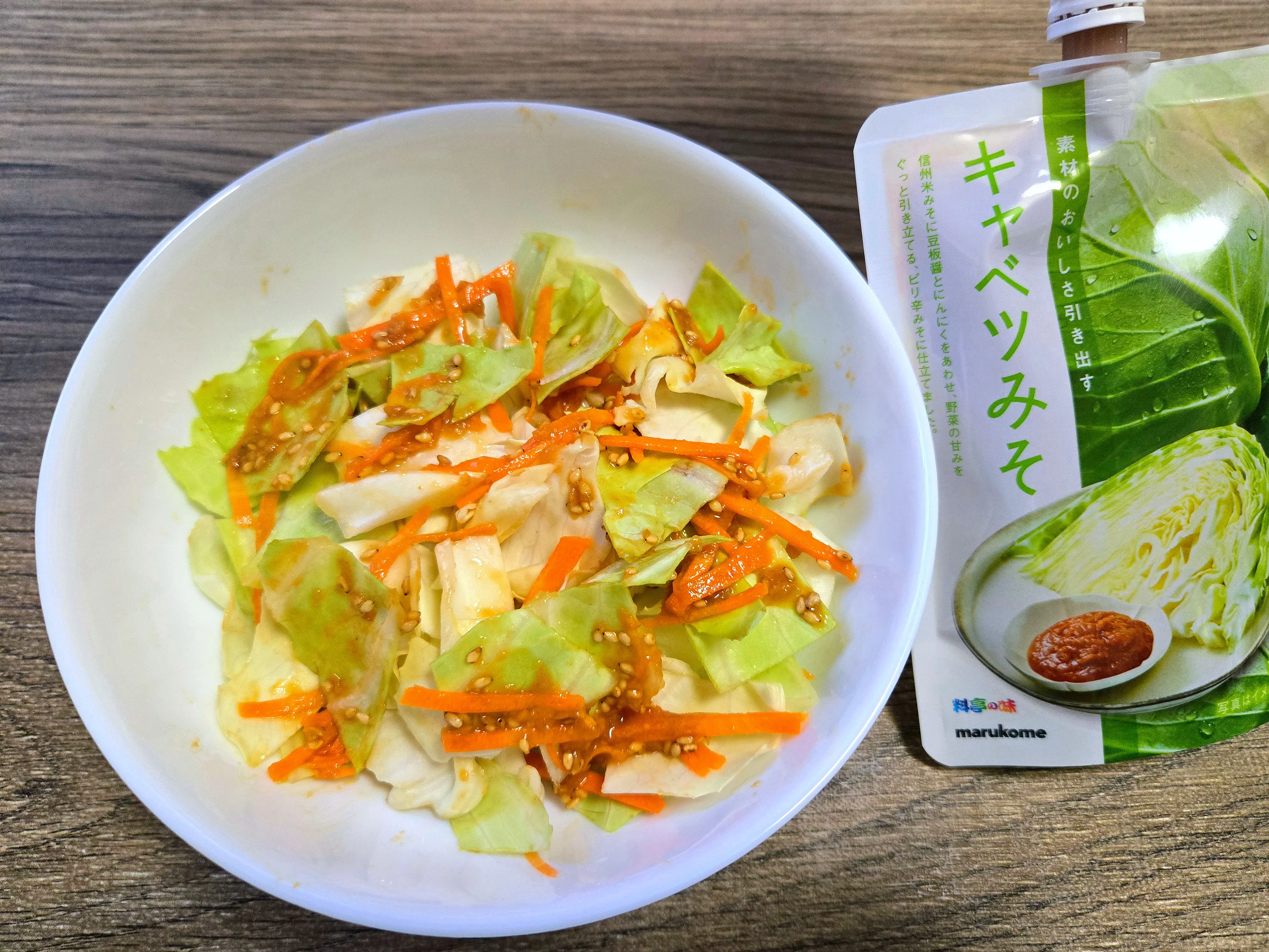 ただ付けて食べても良かったけど、いりゴマをみそに混ぜてキャベツと人参に和えました。