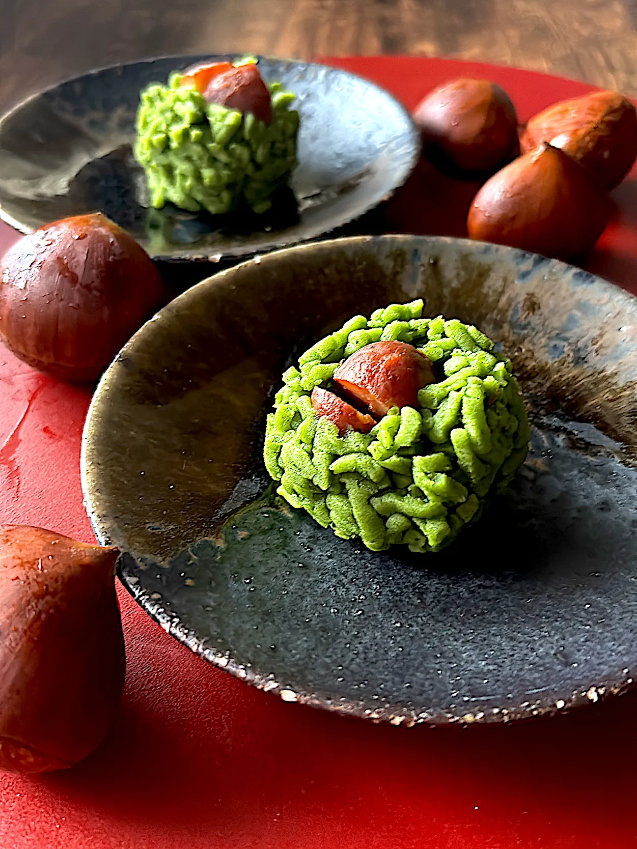 抹茶の練り切りが綺麗やし、渋皮煮の栗がめちゃめちゃ美味しそう゚ですね+.゚(´▽`人)゚+.゚✨