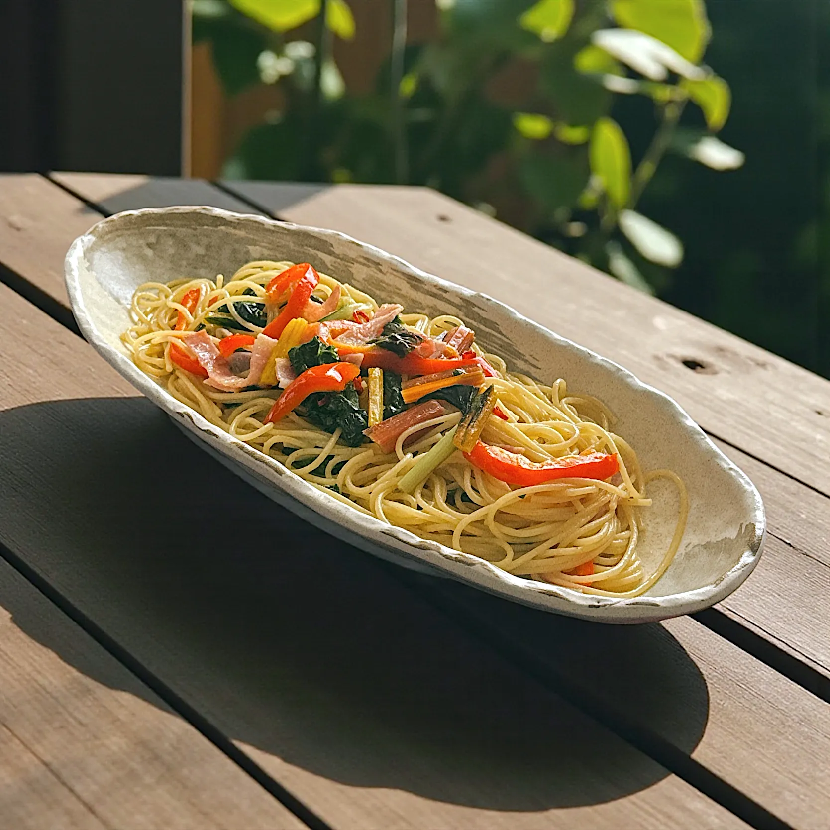 スイスチャード、パプリカ、ベーコンのスパゲティ。