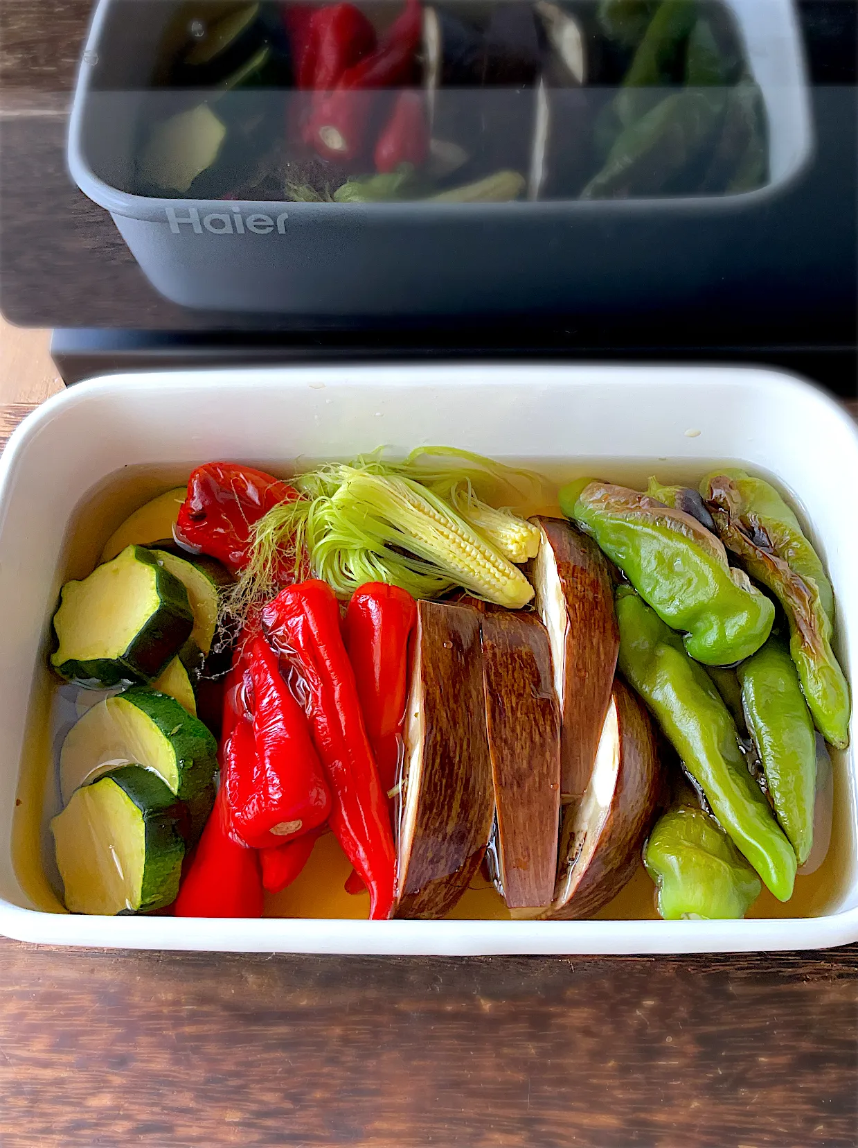 #snapdish #ミラリィ #ハイアール #グリル野菜 #万願寺とうがらし #ズッキーニ #ヤングコーン #ゼブラ茄子 #しまじろう #赤万願寺とうがらし #アルモンデ #これうまつゆ #焼き浸し #野田琺瑯