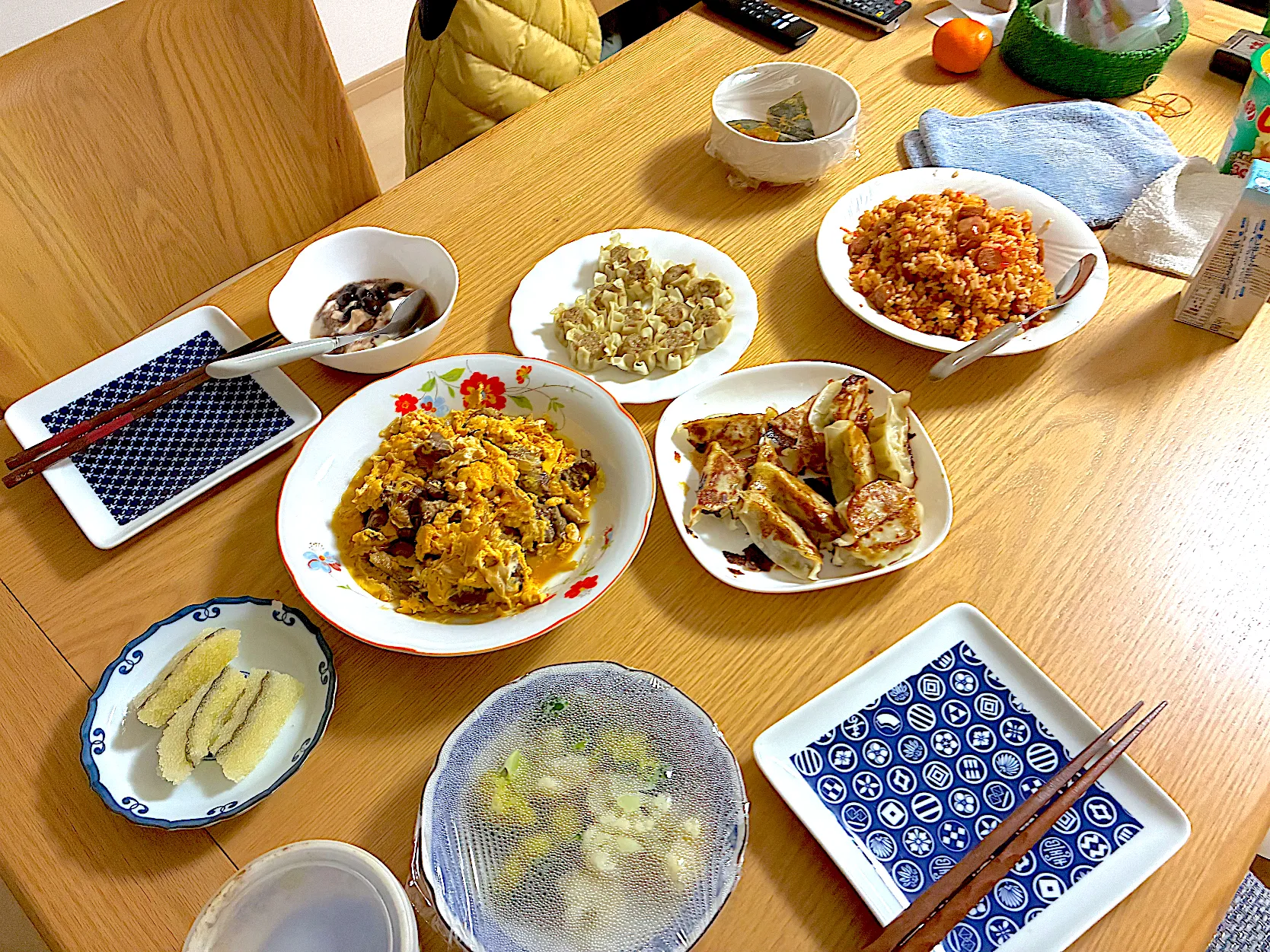 温野菜、カフェ風チキンライス、焼き餃子、焼売、子持ち昆布。