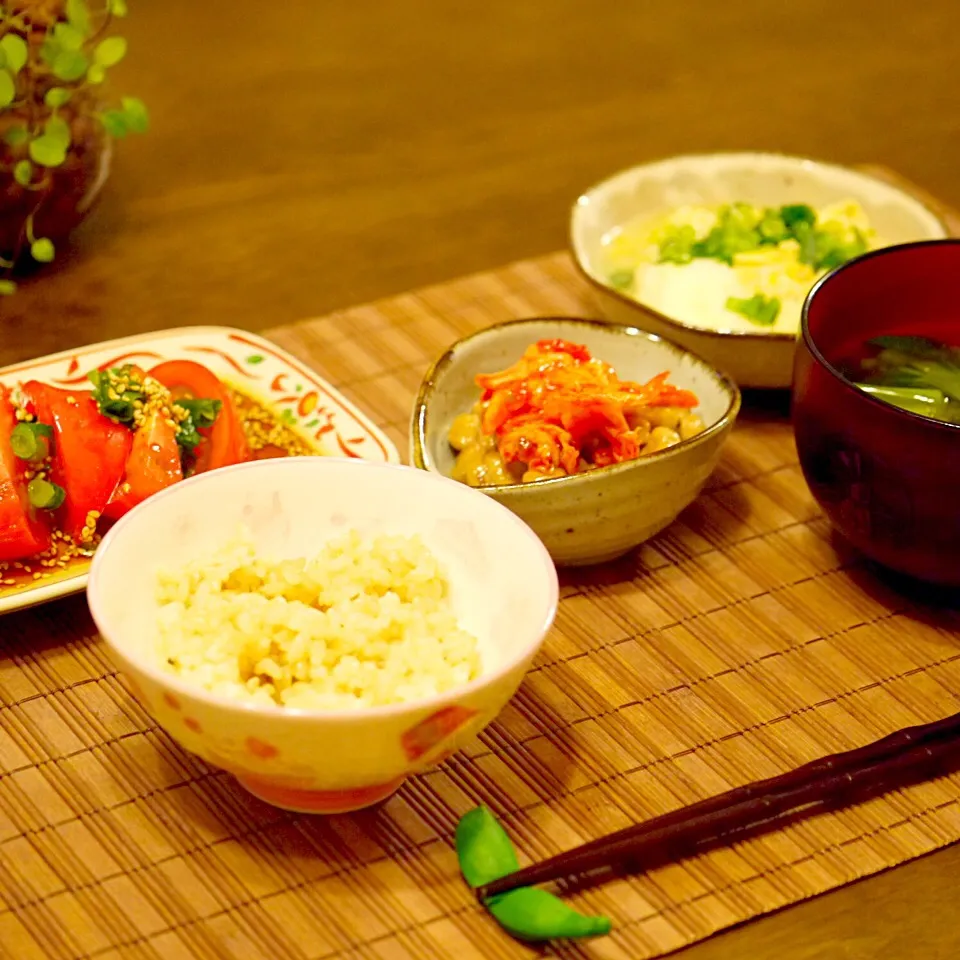 ♪玄米♪お味噌汁♪高野豆腐の卵とじ♪キムチ納豆♪トマト