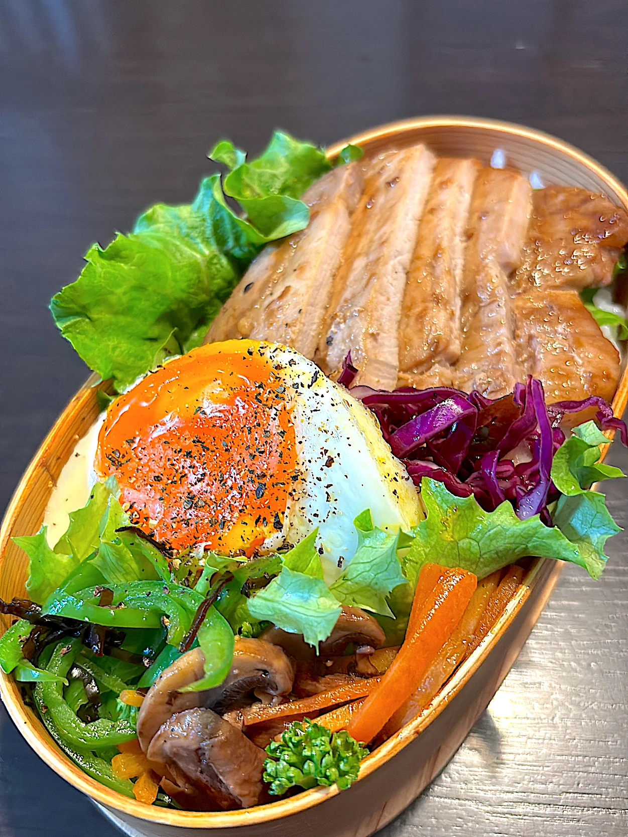 豚ロースは、創味の焼き肉タレに漬けて冷凍しといたもの。フルーティでお肉柔らかくなるし美味しい