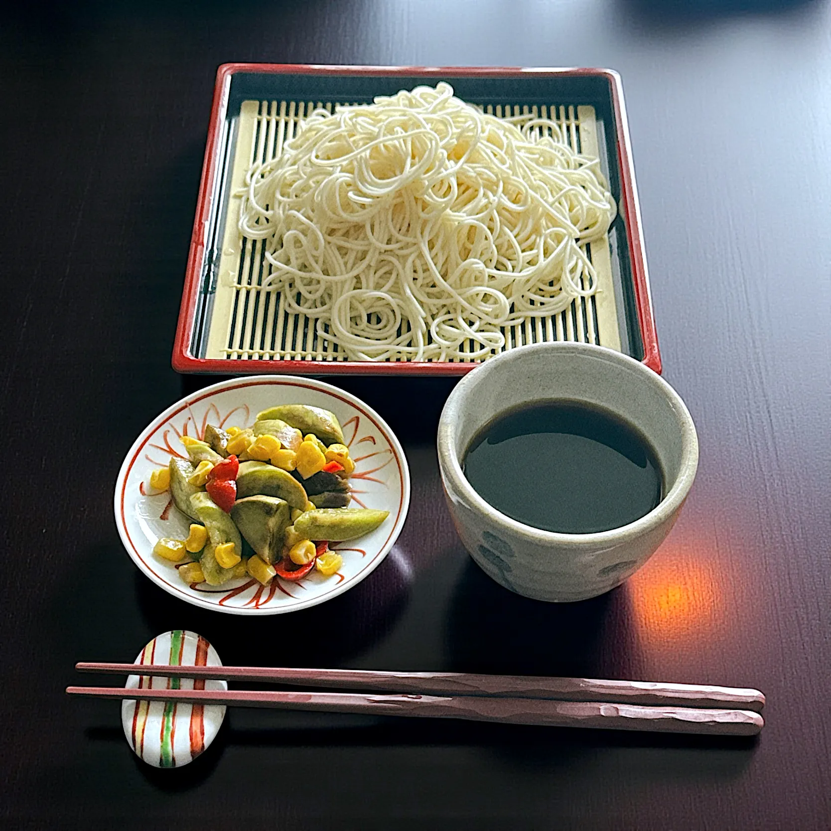 青ナス、紫ナス、赤ピーマン、万願寺唐辛子、コーンのナムル。