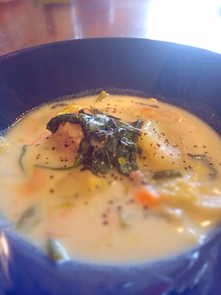 好きな野菜をまず、ひたひたの水とコンソメで煮込む。柔らかくなったら、牛乳をたっぷり入れ、市販ルーをひとかけだけ投入。食べれる時に胡椒を。やさしい味のシチューです。