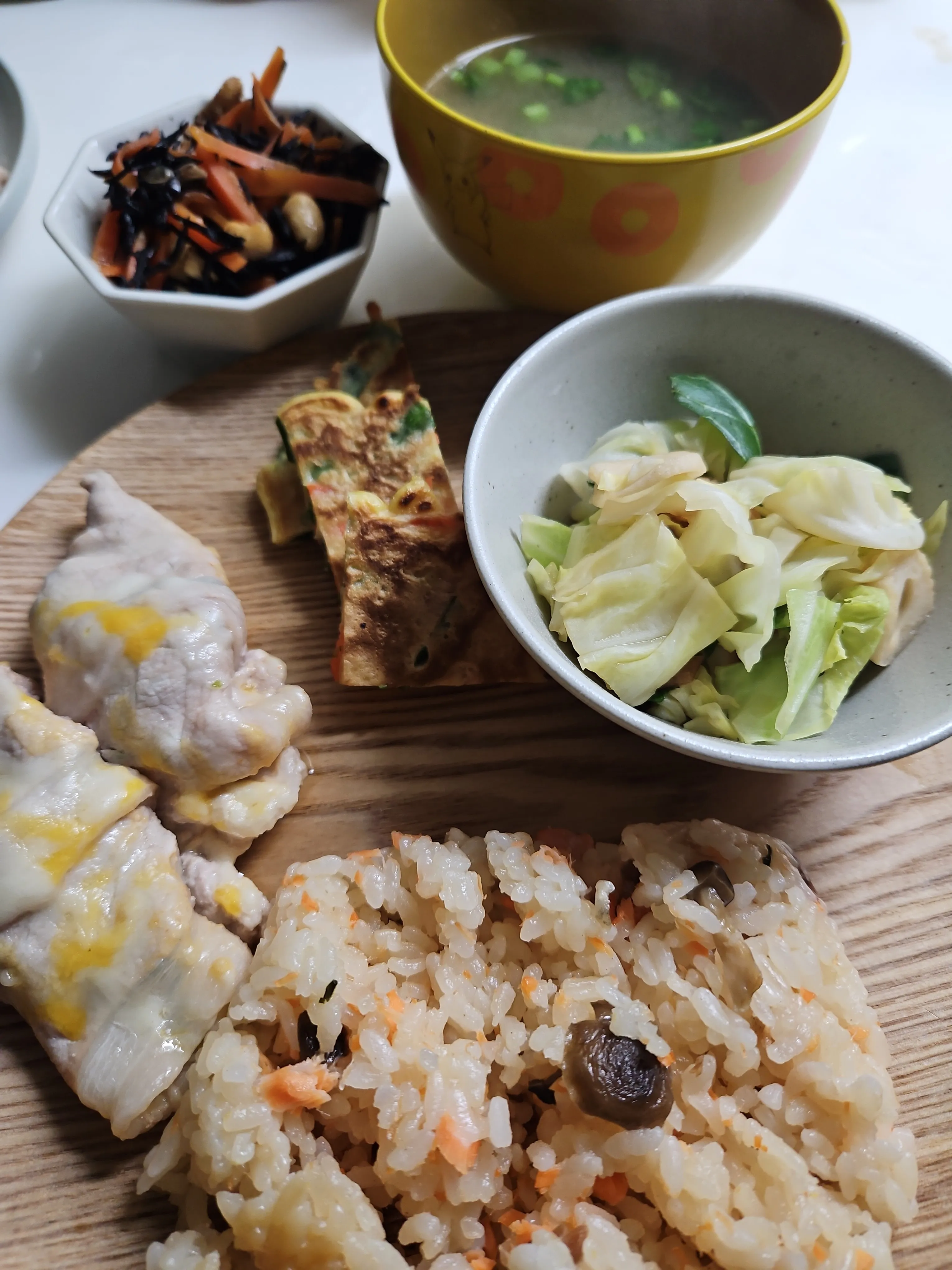 ☆夕飯☆キムチチーズ豚巻き、チヂミ、ひじき、キャベツちくわ煮浸し、味噌汁、鮭炊き込みご飯