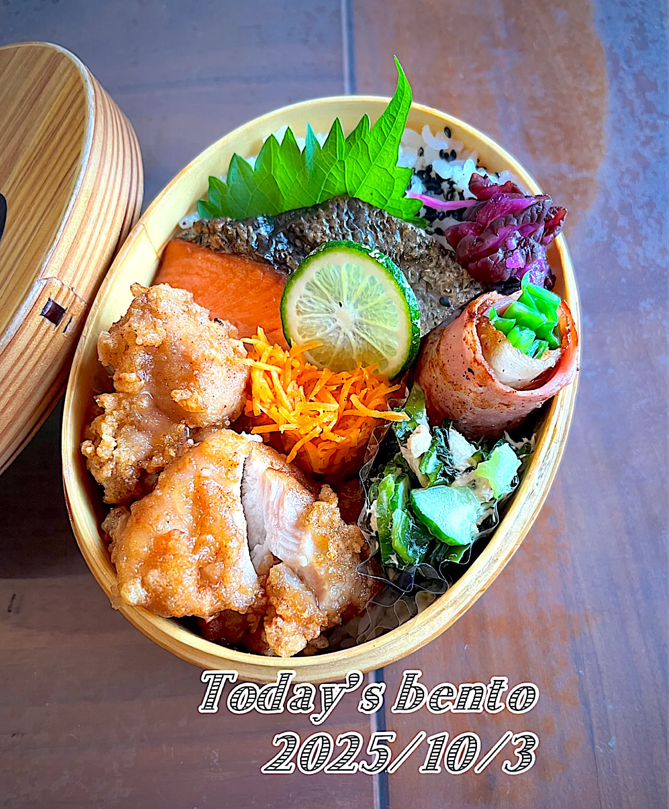 #今日のお弁当 #女子高生弁当 #曲げわっぱ弁当 #まげワッパちゃんお弁当箱 #しゃけ弁当 #からあげ弁当