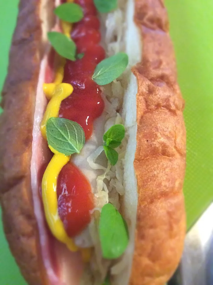 コッペパンにザワークラウト、ベーコン、ソーセージ、ケチャップ&フレンチマスタード、マジョラム。
