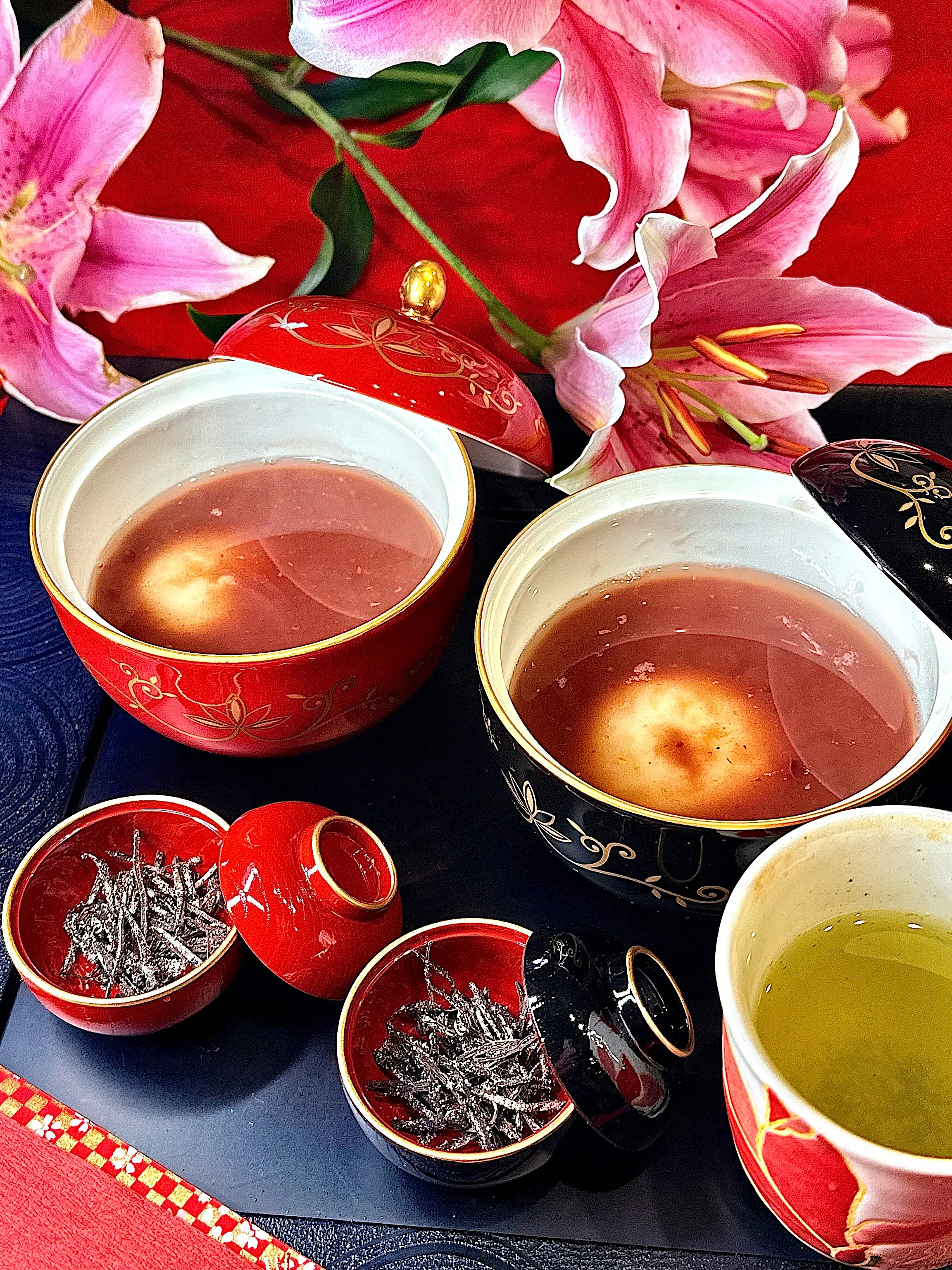 私はぜんざい、お汁粉、おはぎは苦手で食べないんだけど器がお揃いできれいね