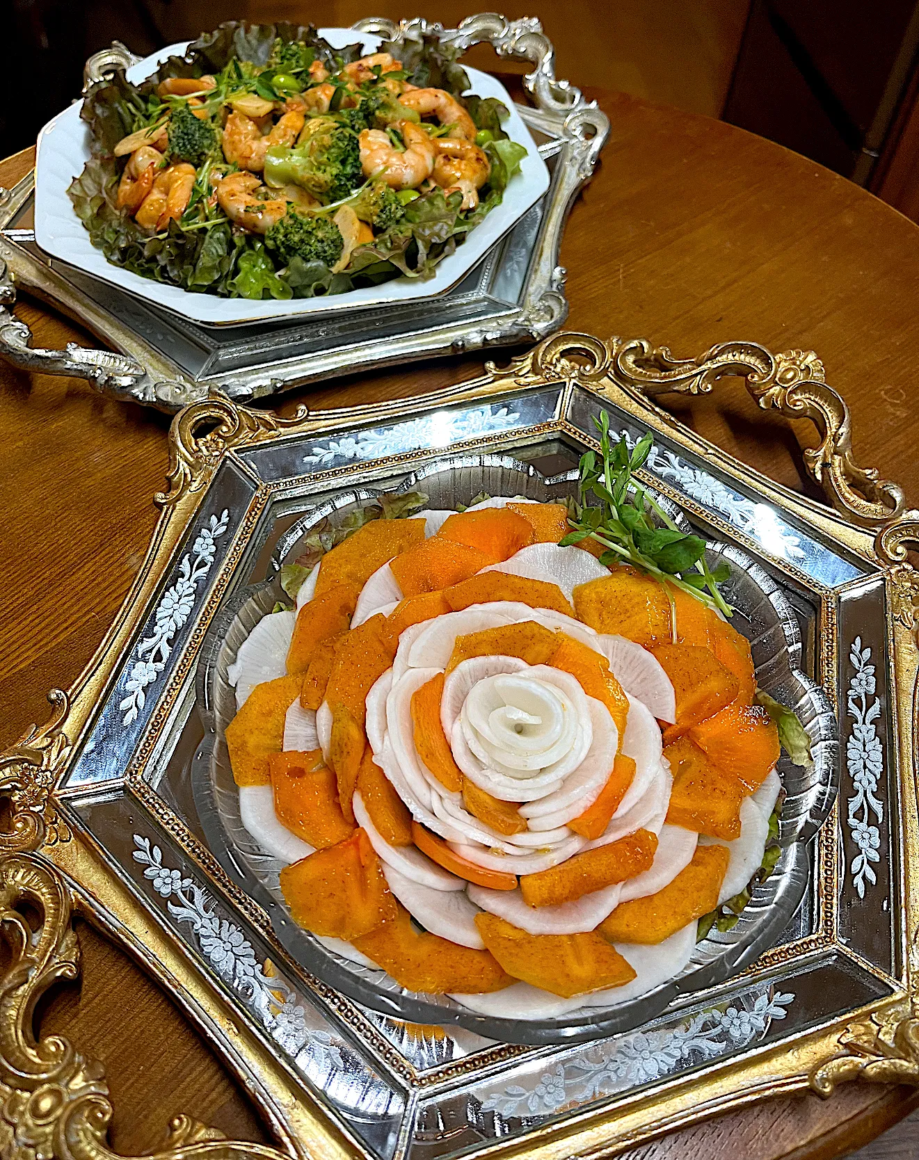 柿と大根のカプレーゼ💐シラチャーエビチリ