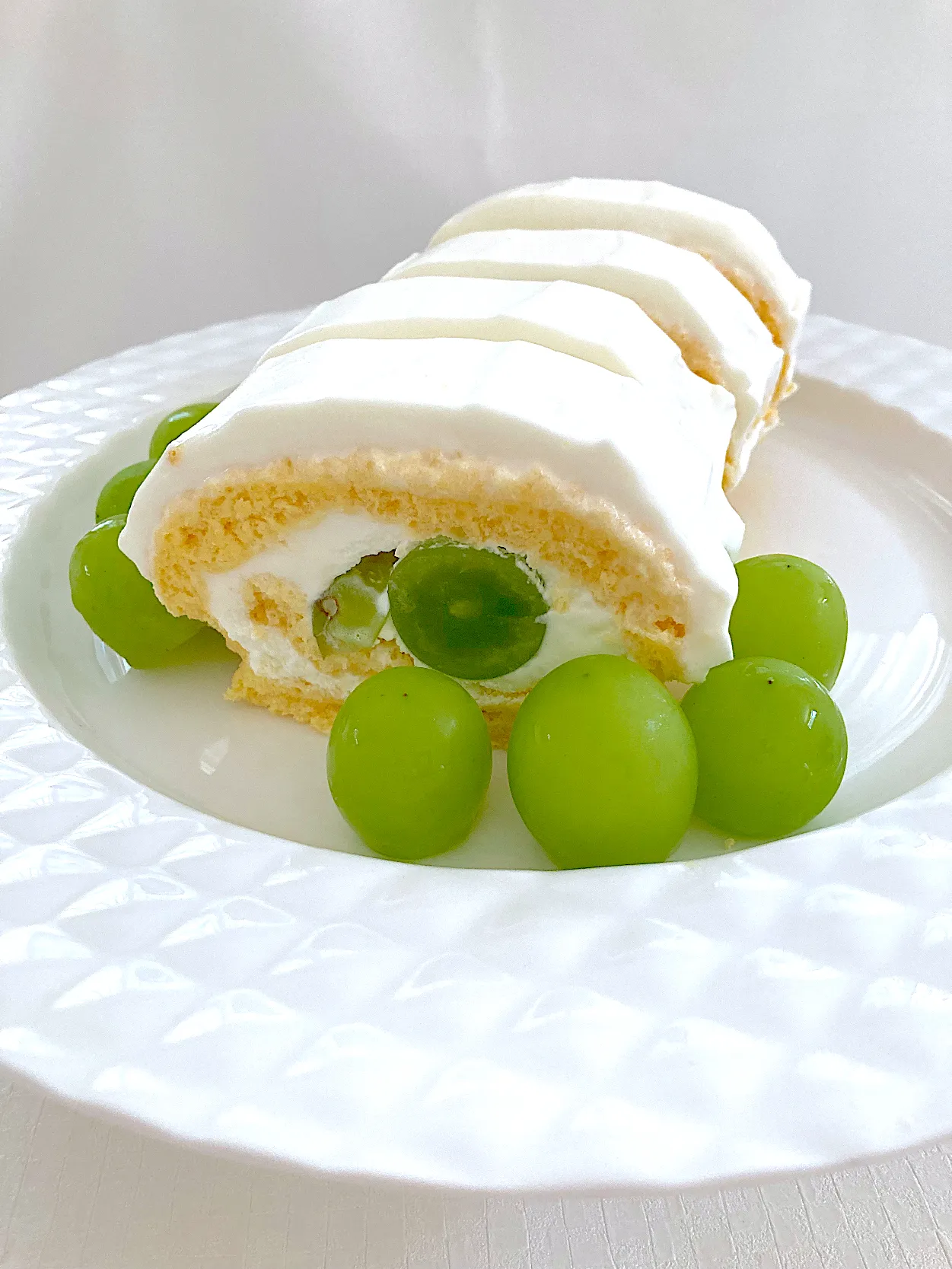 白いお皿にシャインマスカットのロールケーキが凄く映えてます😍
