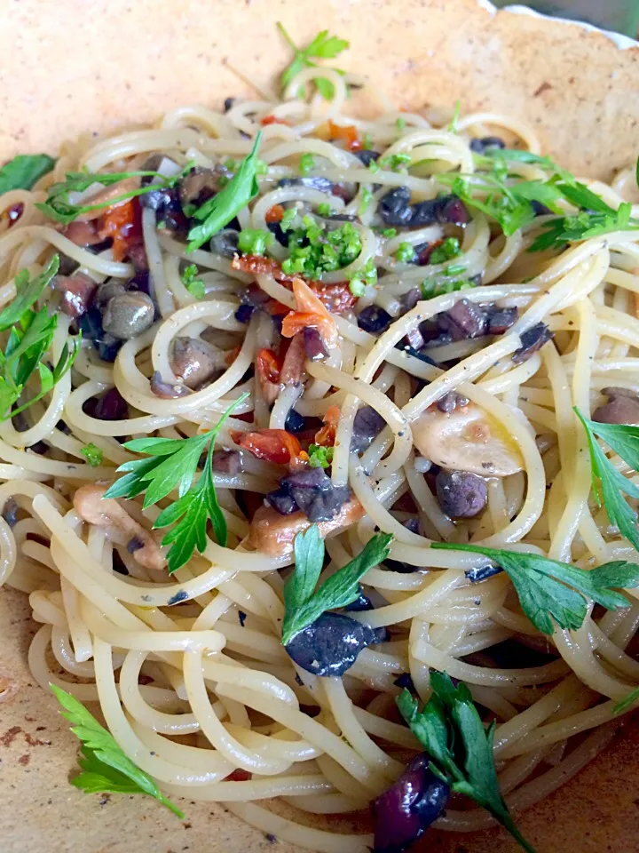 アンチョビ、ケッパー、オリーブと塩分が含まれている食材なので、塩加減に注意。パスタ茹で汁は少なめに。