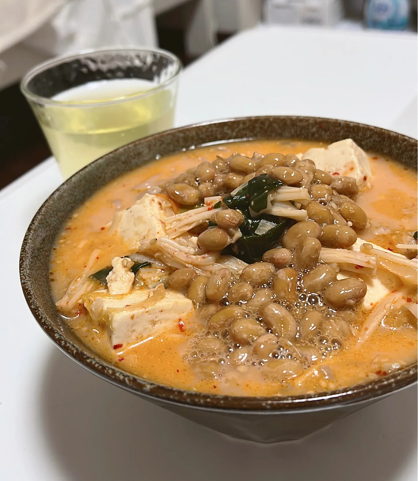 昨日のスープに豆板醤で炒めた肉味噌とネギみじん切りと豆乳入れて坦々スープっぽくした うまかった