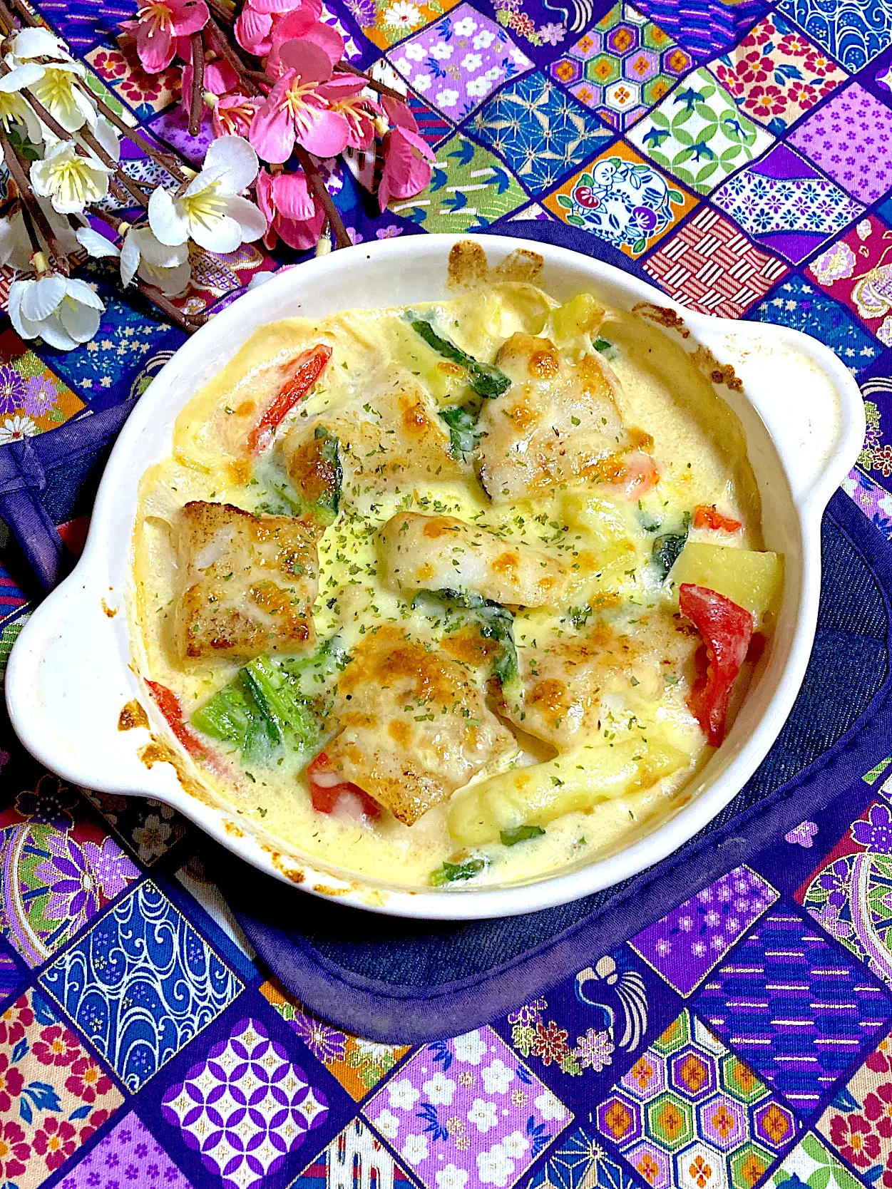 鱈に野菜と牛乳使いで簡単にグラタン風にしました😄
