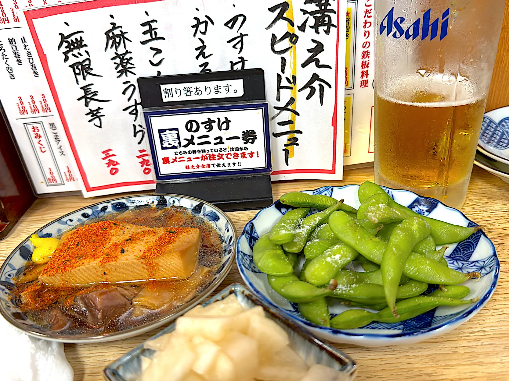 のすけ肉豆腐と枝豆、ビール|あべたかひろさん