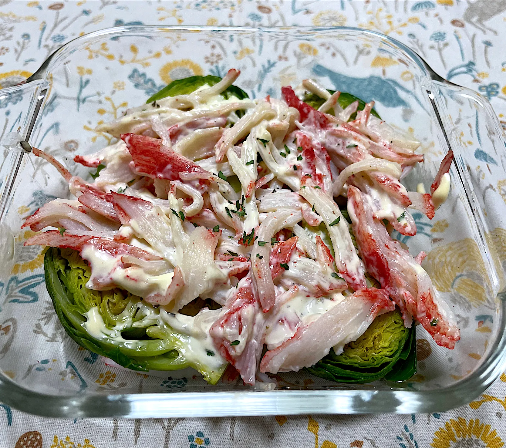 芽キャベツを電子レンジで加熱して、カニカマとマヨネーズをあえたものをのせただけです