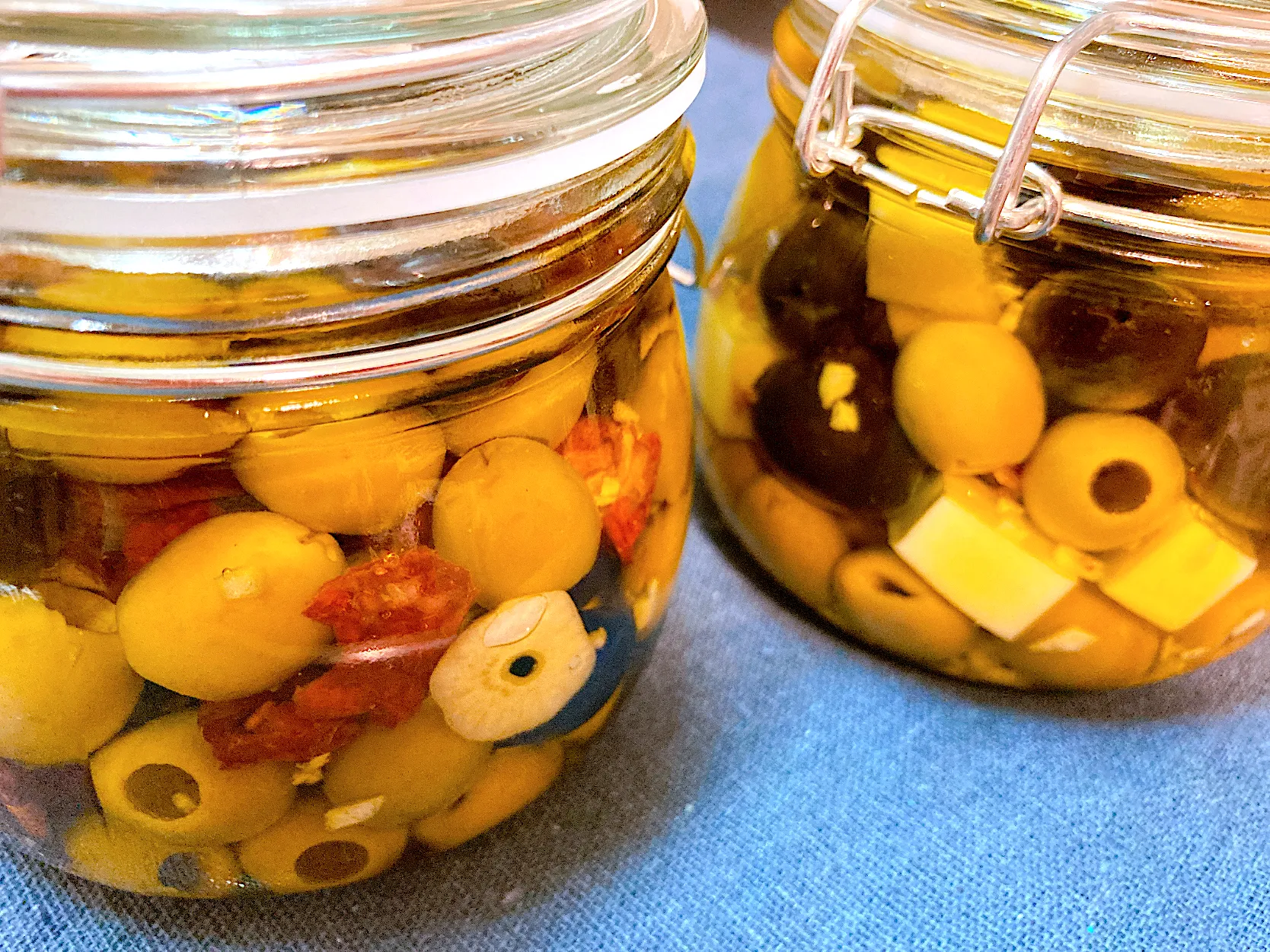 ①ドライトマト&ニンニク、②モッツァレラアンチョビニンニク。週末友達とワインを飲むので。美味しく出来ますように🎵 #オリーブの実 #ワインのお供