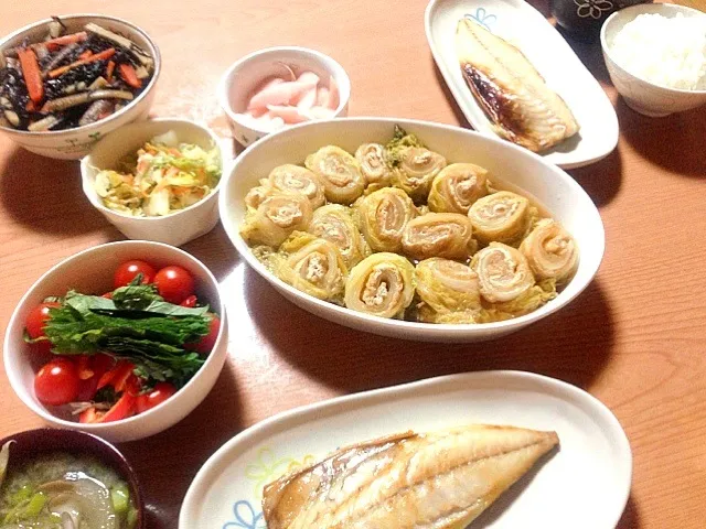 白菜と油あげのくるくるは油抜きした油あげを、下ゆでした白菜で巻いて、爪楊枝で止めて切って煮たの