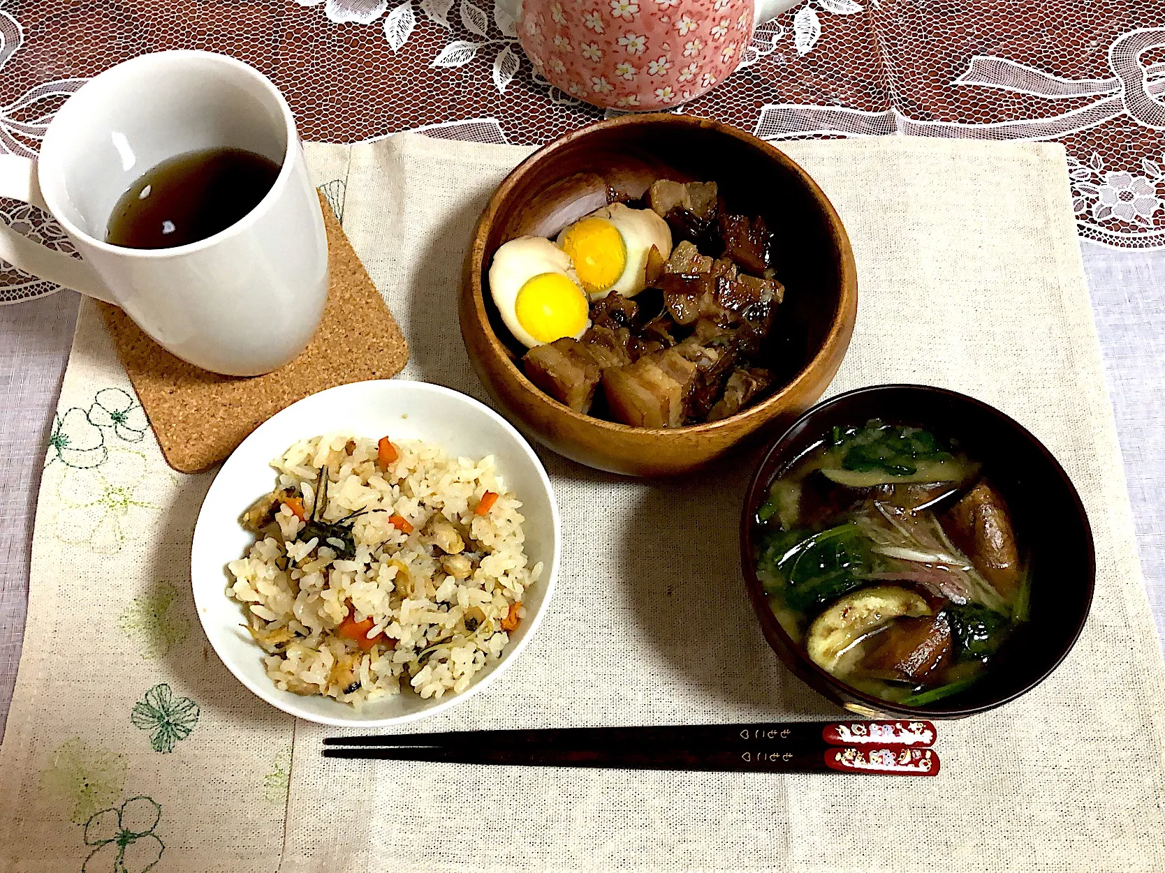 豚の角煮、水菜とあさりの炊き込みご飯、ナスとほうれん草の味噌汁(あさりダシ)