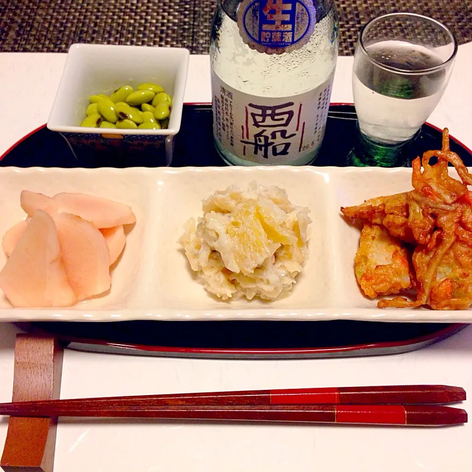 駅前のお酒屋さんで買った地元の名前のお酒!新生姜!数の子山葵!契あげ!味豆で乾杯!!! #showchu #家居酒屋 #宅呑 #手抜料理 #西船