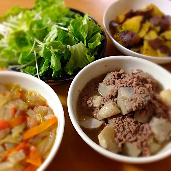 大学イモ・レタスとミニセロリのサラダ・里芋と挽肉煮・白菜と玉ねぎ人参煮。