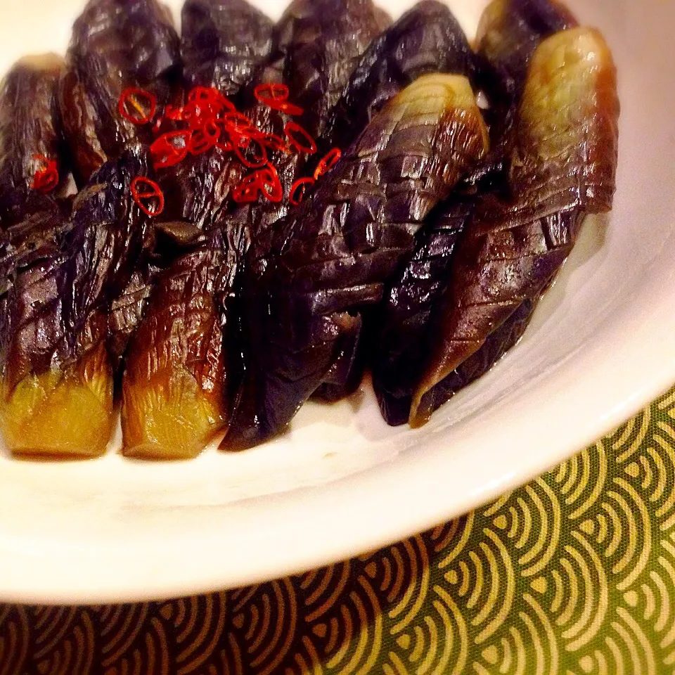 なすに切り込みをいれて軽く焼いたあとに、めんつゆと水としょうがをいれて煮込んで出来上がり✨