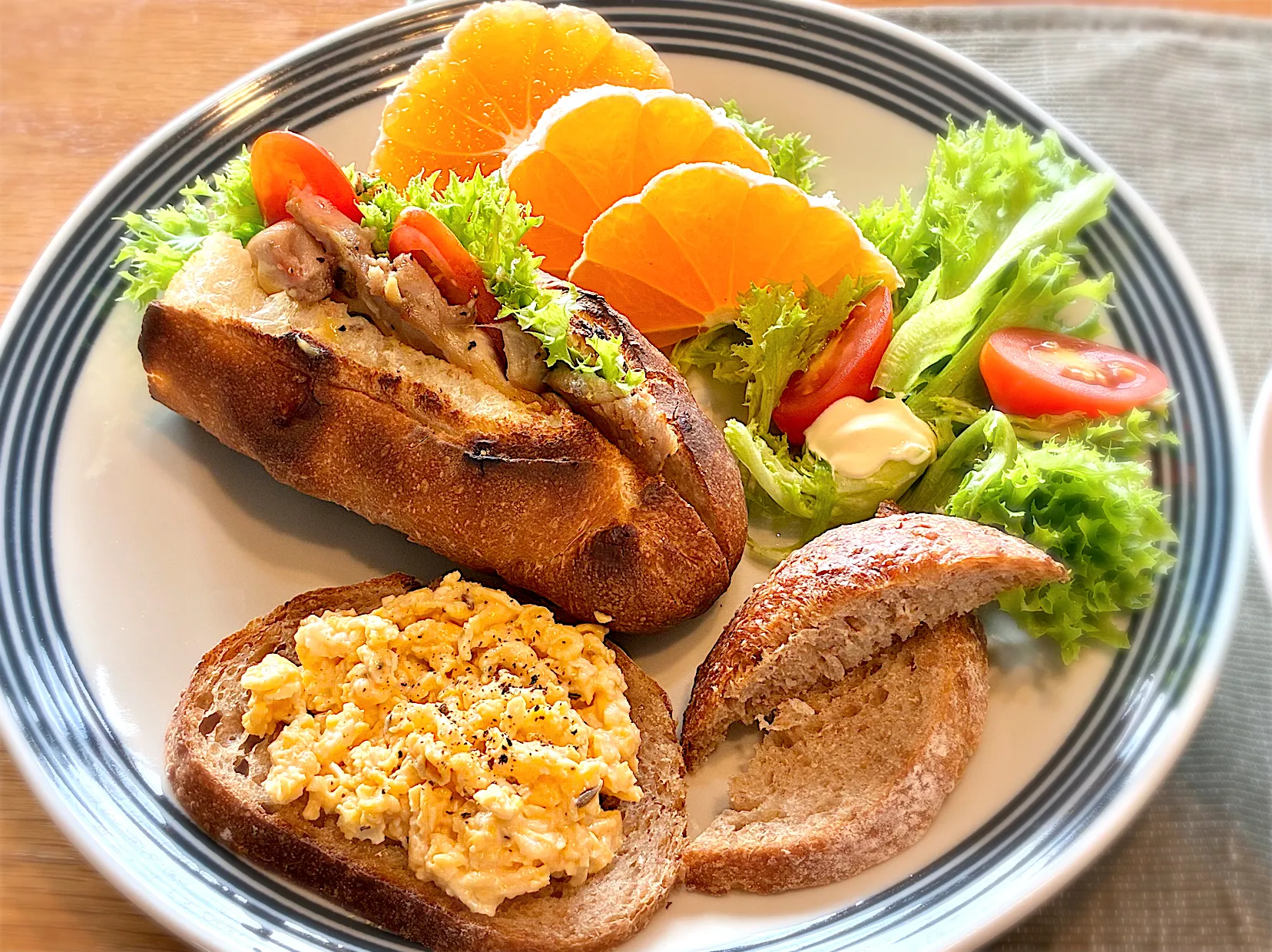 鶏ソテーサンドと炒り卵パンのブランチ|じゅんさんさん