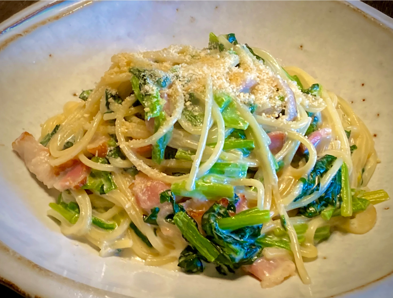今日の麺好きランチは                                               「ほうれん草•ベーコンのクリーム調スパ」|mottoさん