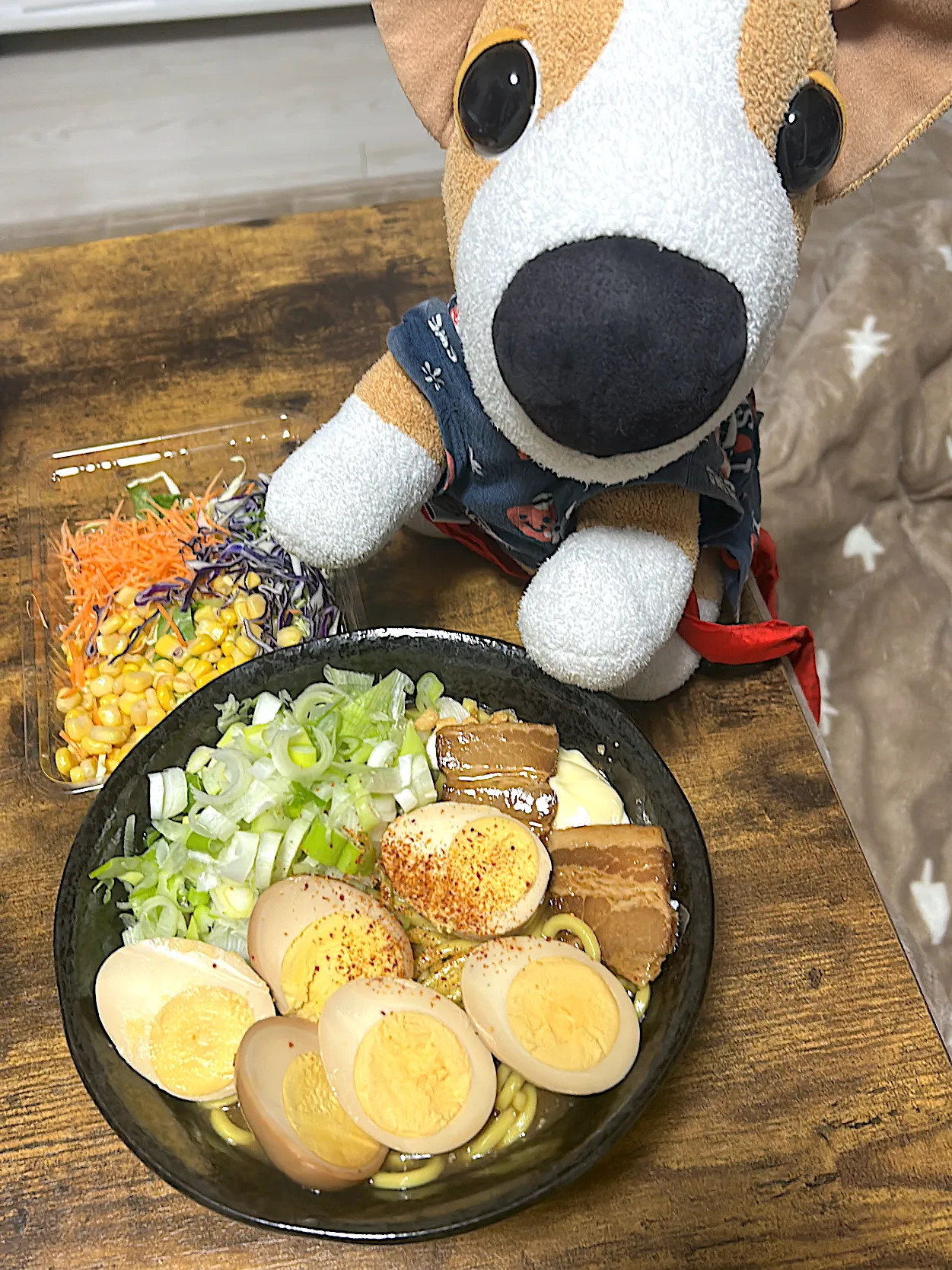 #鶏ガラ魚介ラーメン #サラダ #男子大学生 #人形 #一人暮らし