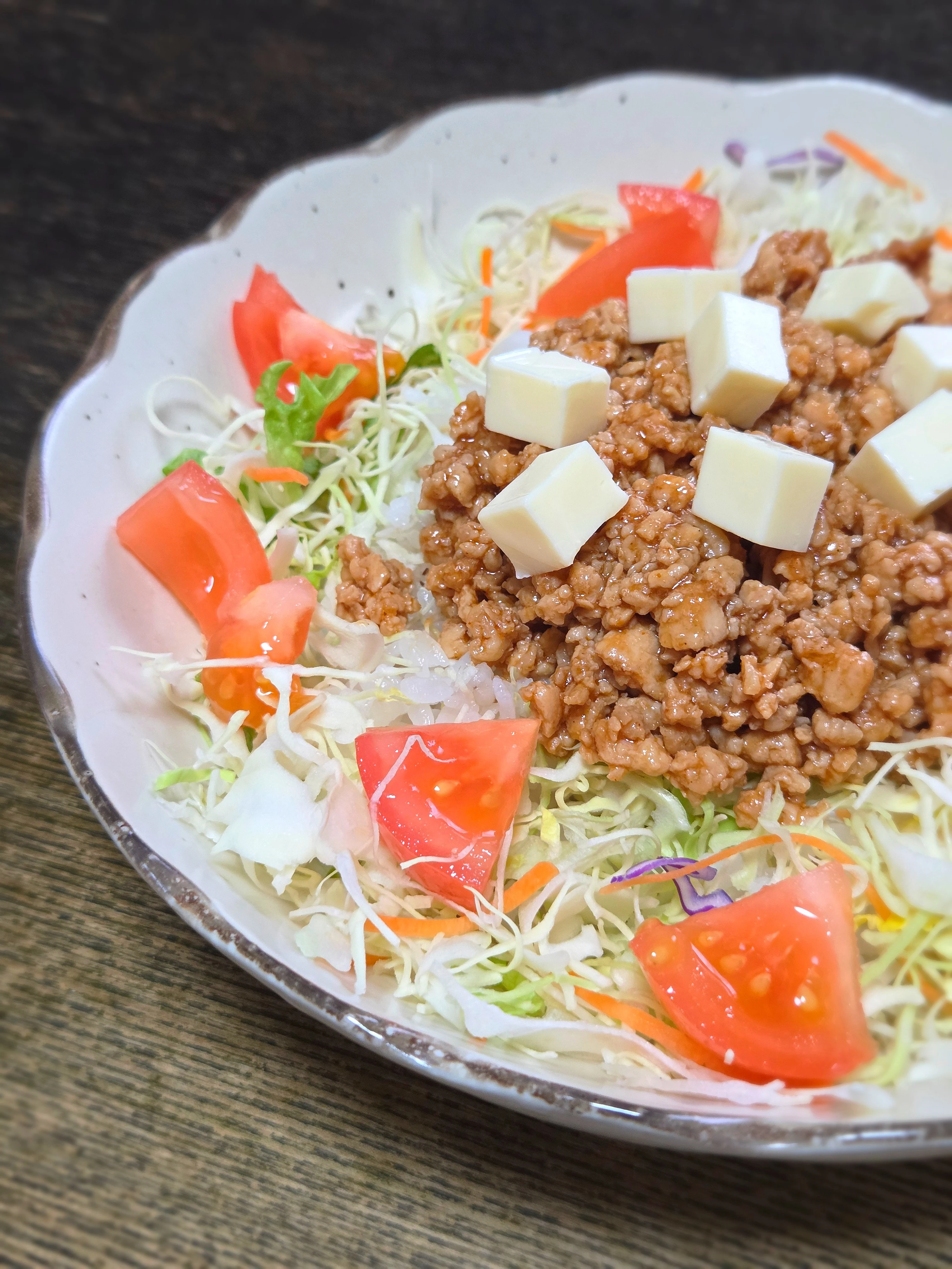 #ランチ #タコライス #鶏ひき肉 #焼肉のタレ #チリパウダー #カット野菜 #ベビーチーズ #トマト
