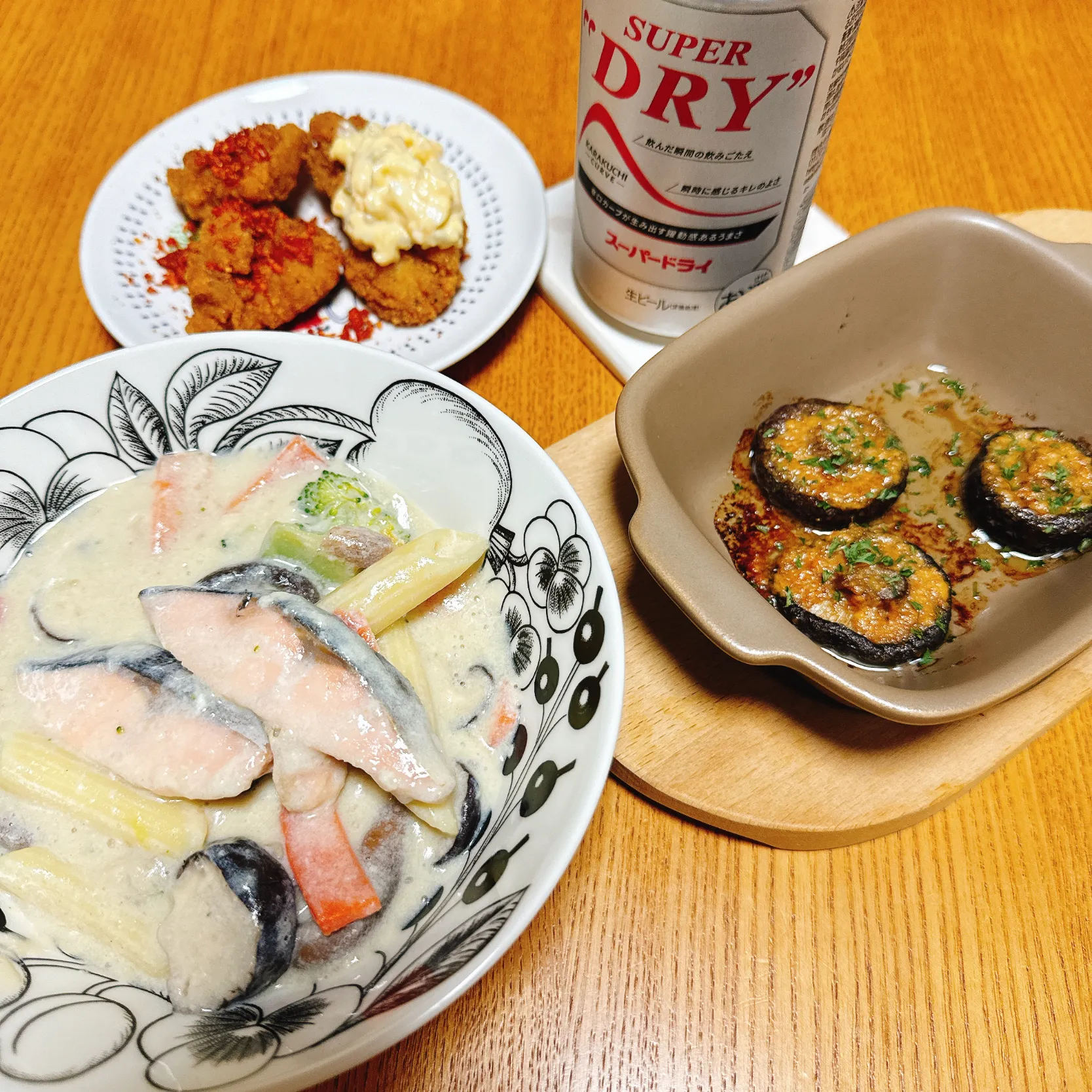 椎茸のガーリックバター焼き 鮭のクリーム煮 フライドチキンはタルタルかけたり、クリスピーチキンシーズニングかけたり 🍻