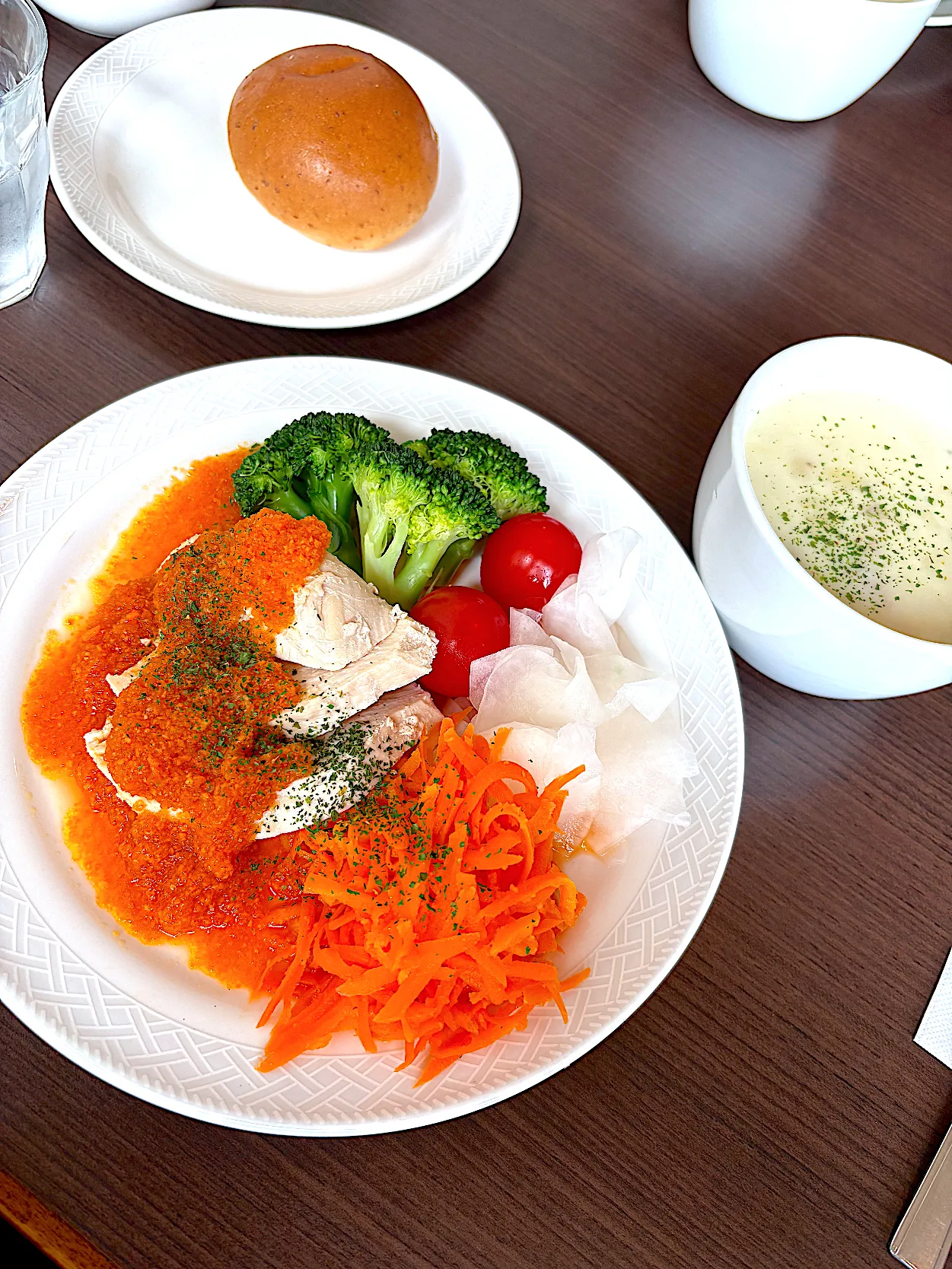 ニューイングランドスタイルクラムチャウダー、人参ドレッシングで食べる茹で鶏と彩り野菜のサラダ #肉の日 #サラダ