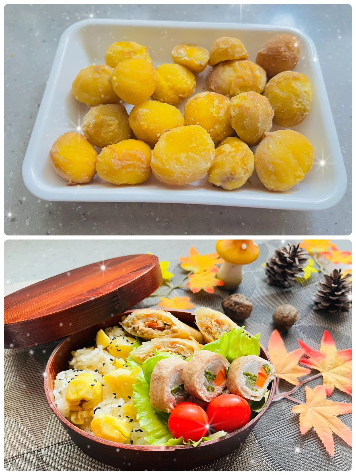栗おこわに春巻きに野菜豚肉巻き😍✨