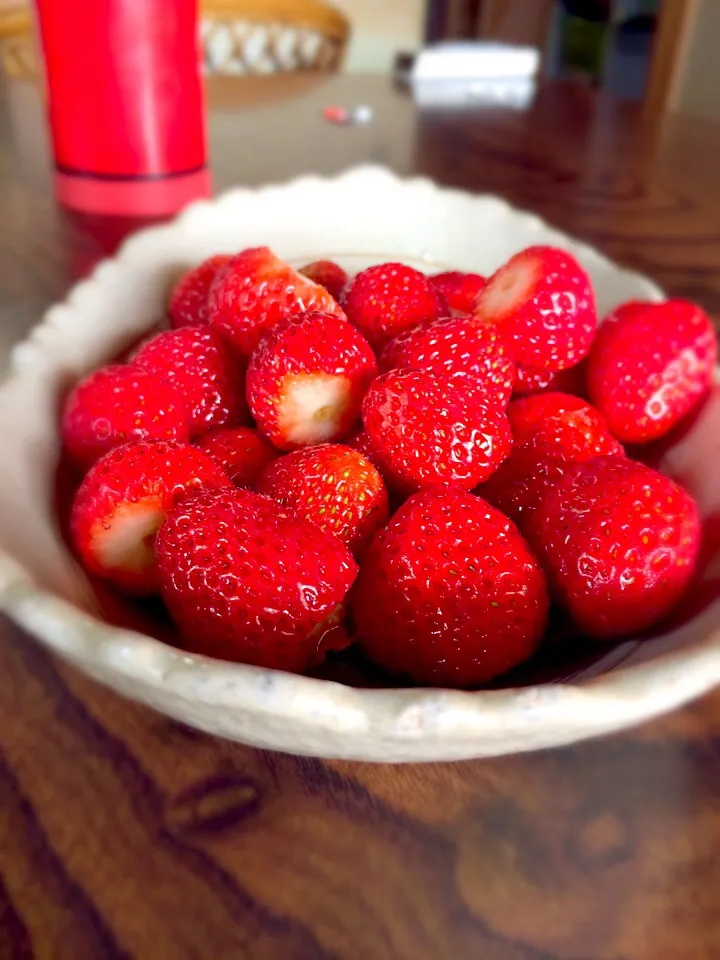 お母さんが朝から苺を摘んで朝食に出してくれました。