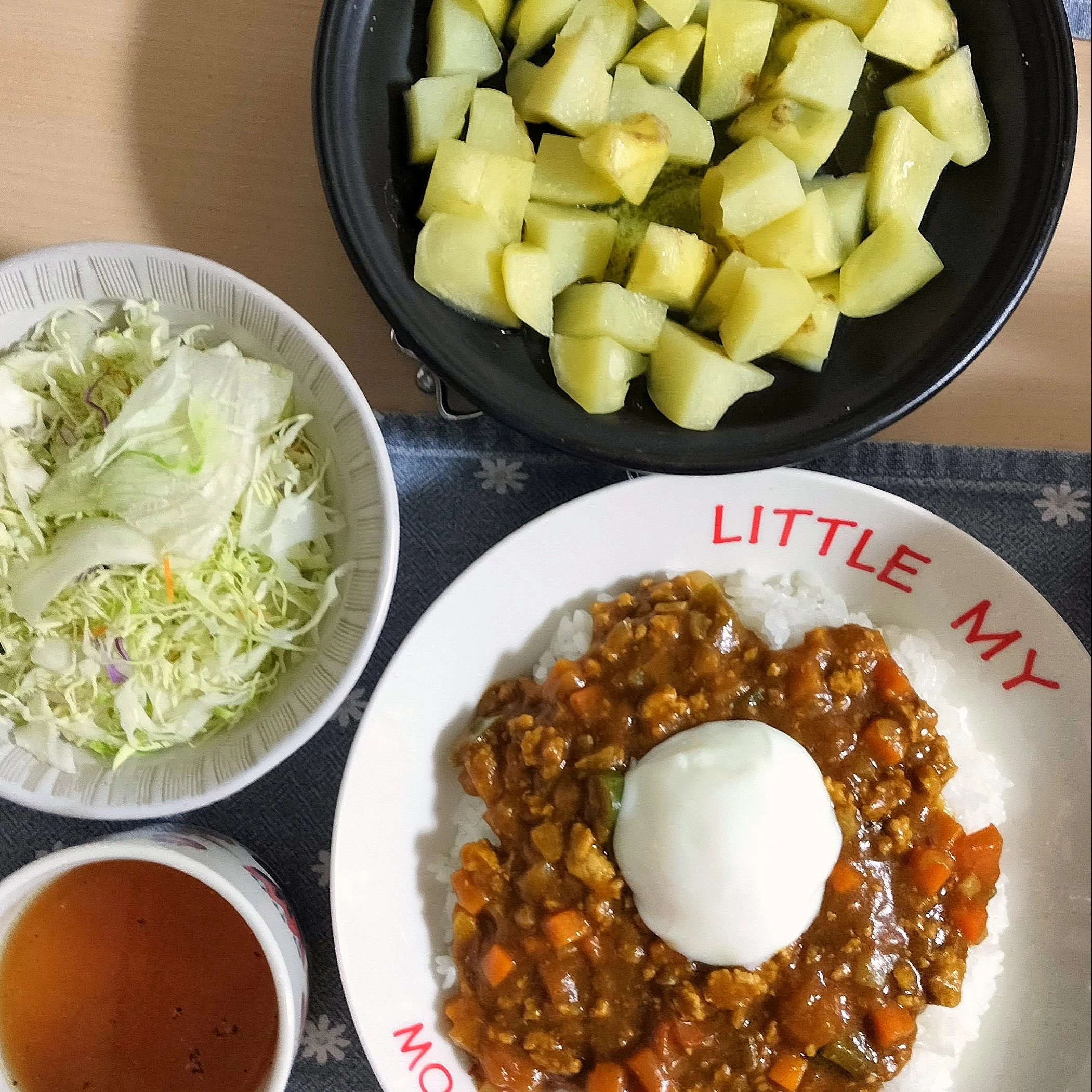 🌛*゜キーマカレー / じゃがバタ / サラダ / コンソメスープ
