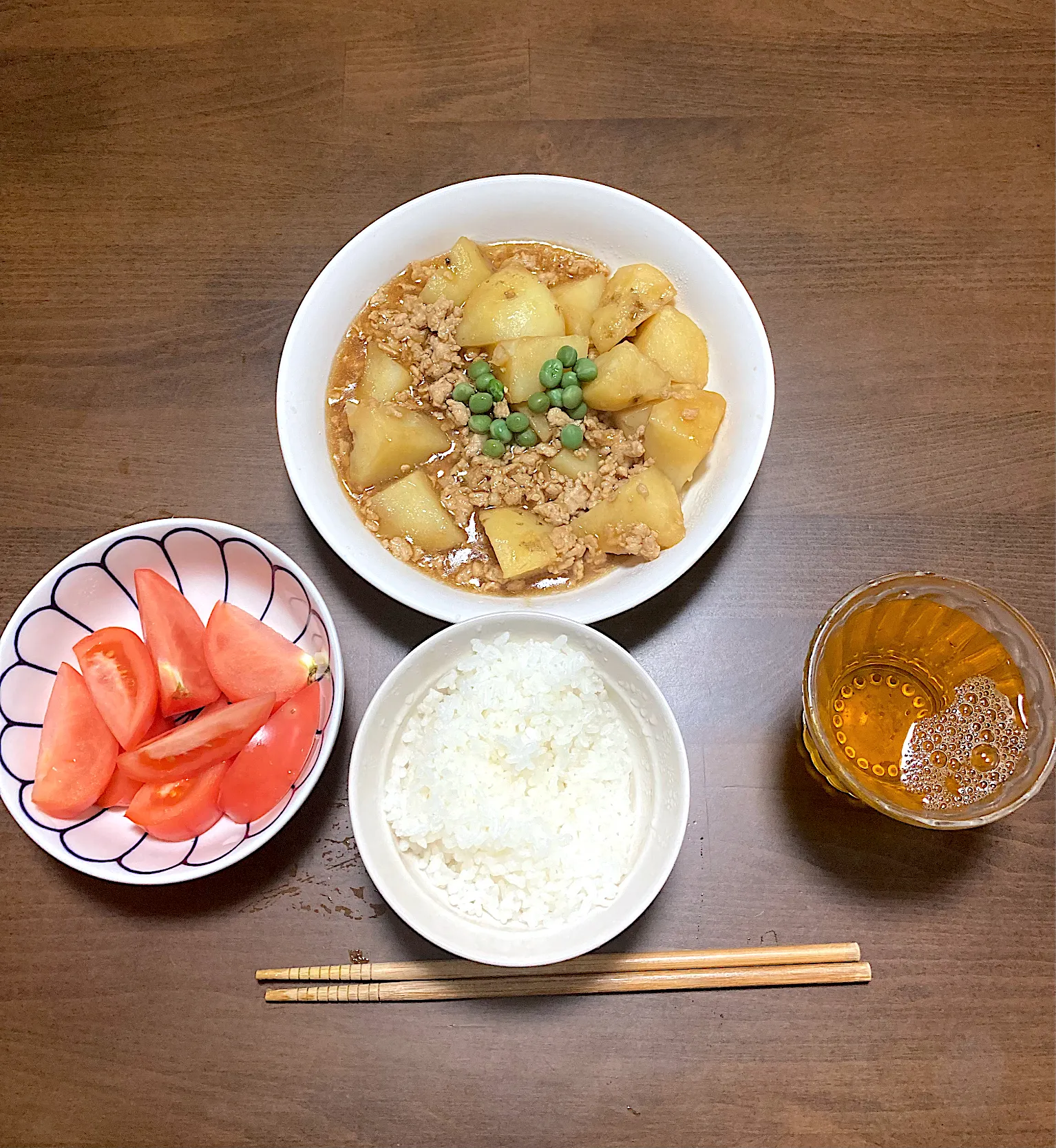 今日の晩ご飯⑧ じゃがいものそぼろ煮 ボウルによそり、グリーンピースをのせてテーブルにサーブし、いただきまーす😋