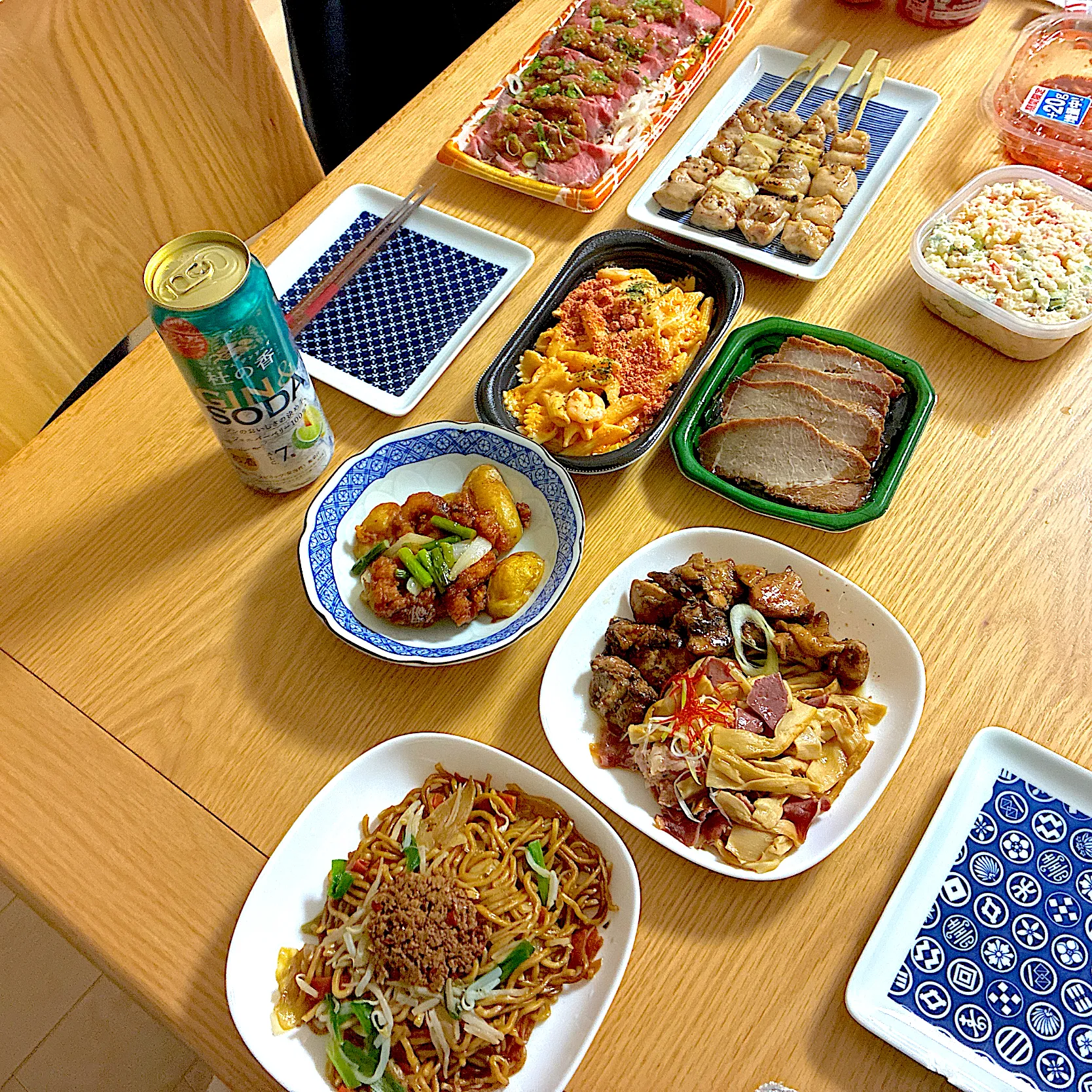 ローストビーフ、焼き鳥、イカとじゃがいもの甘辛揚げ、台湾焼きそば、ひとくち炭火焼き鳥、豚たんめんまピリ辛炒め、焼き豚、トマトクリームパスタ、手作りポテトサラダ。