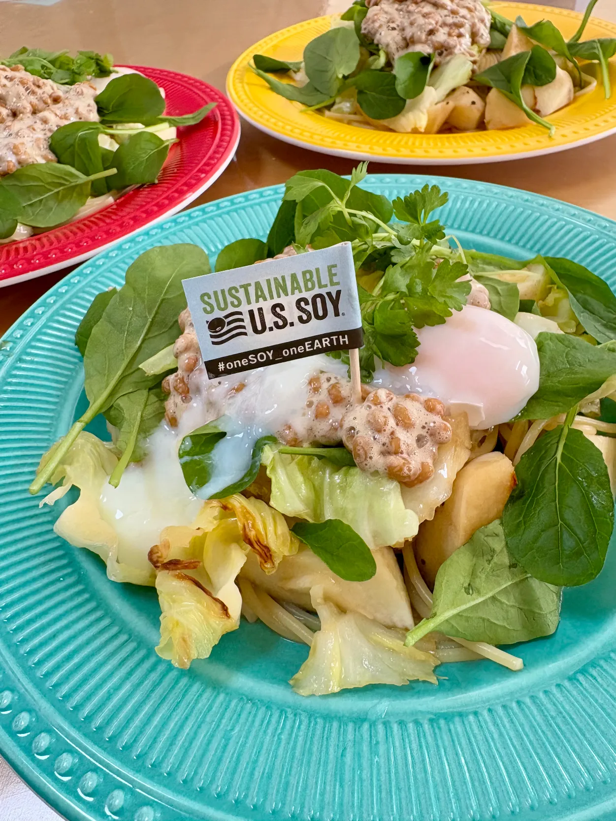 具材は、ネバネバお仲間の長芋とたっぷりのベビーリーフ、温泉卵、最後におちびさんつゆだくをのせて完成