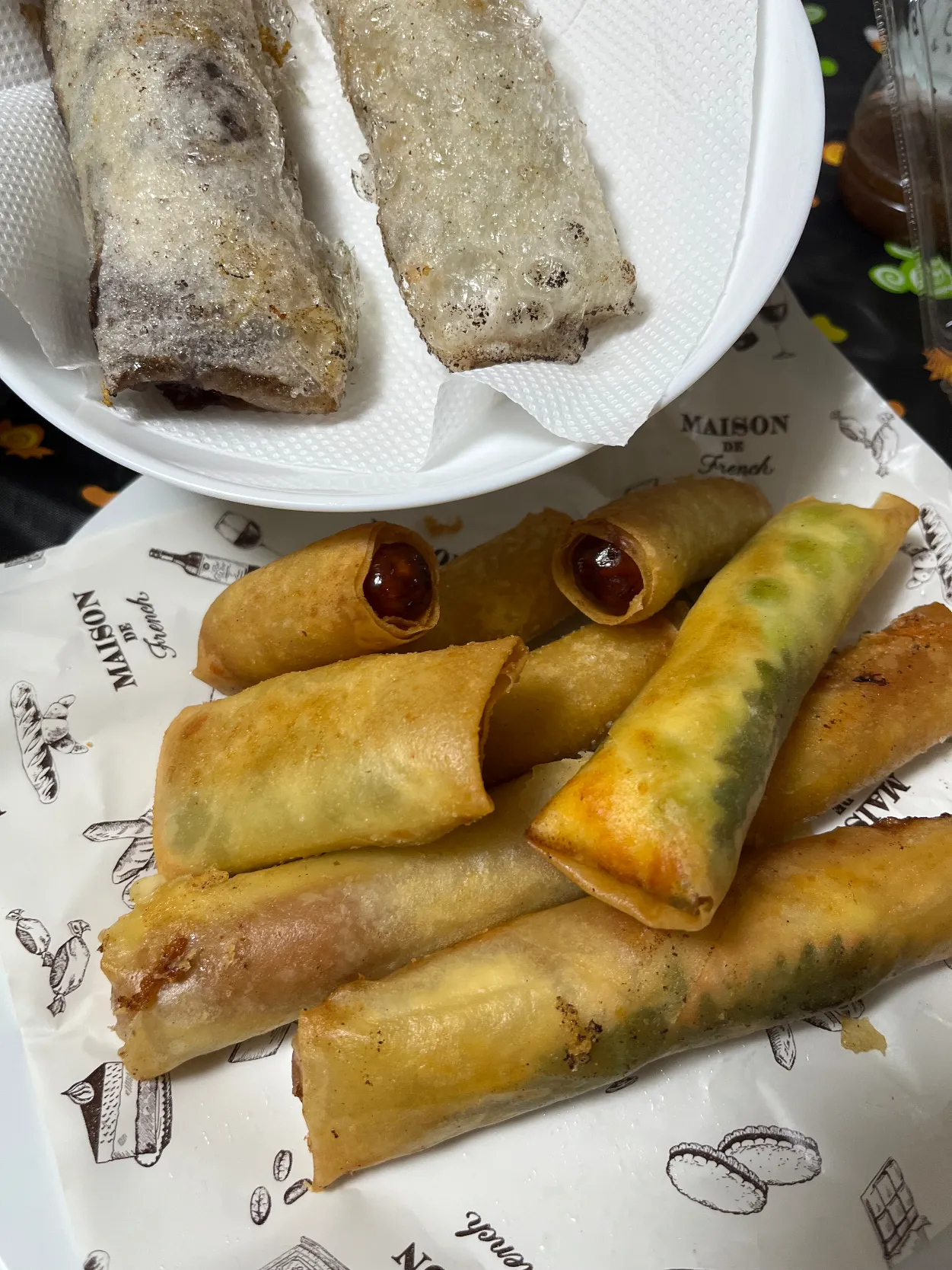 冷凍、冷蔵庫の中で好きなもの選んで巻いて揚げちゃえです そしてたべきれないので冷凍庫行きです。😆