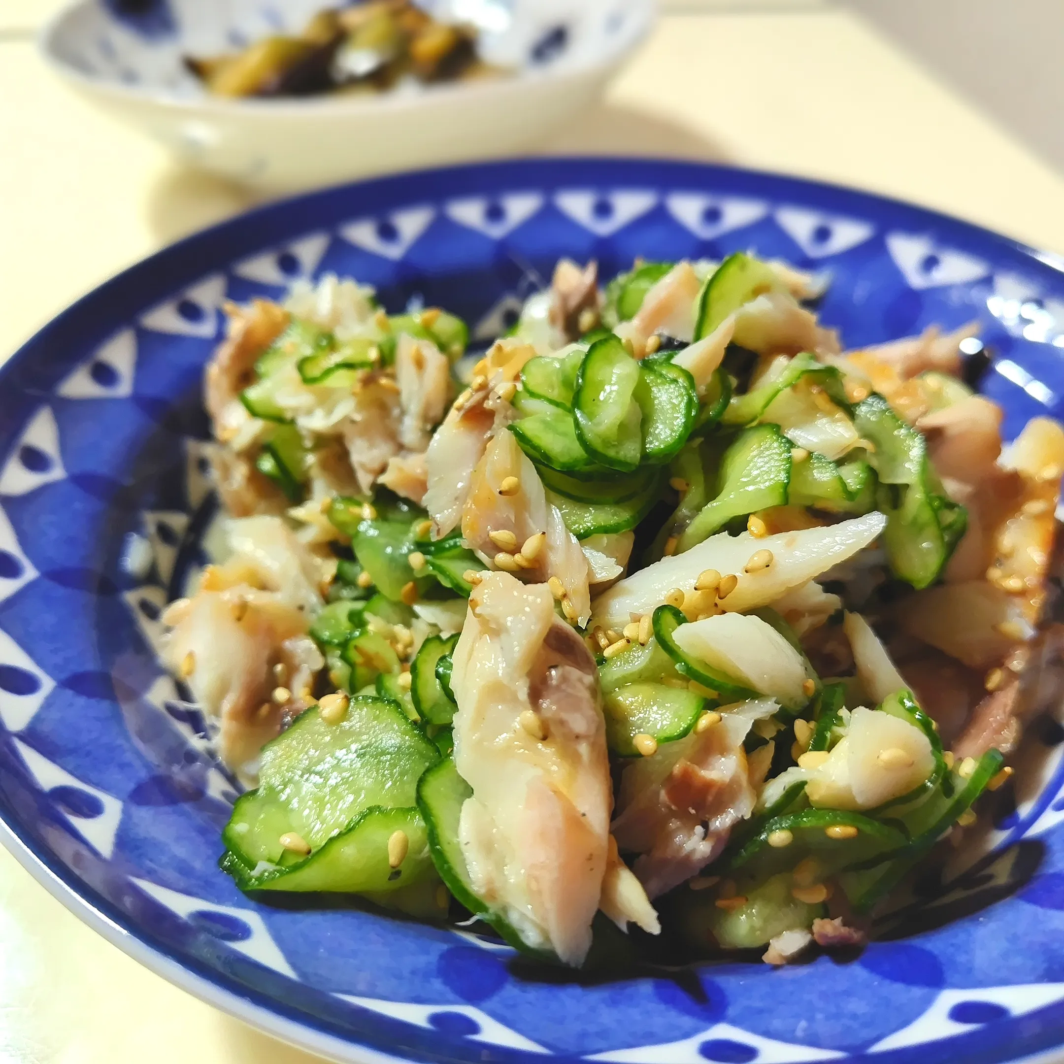それではと、本日ほぐした鯵の干物と塩もみきゅうりを三杯酢で和えました。