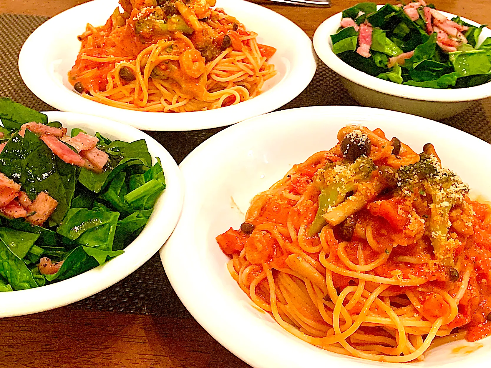とりあえず冷蔵庫と相談して、海老・しめじ・ブロッコリーのトマトクリームパスタとベーコン&ほうれん草のサラダを🥗✨