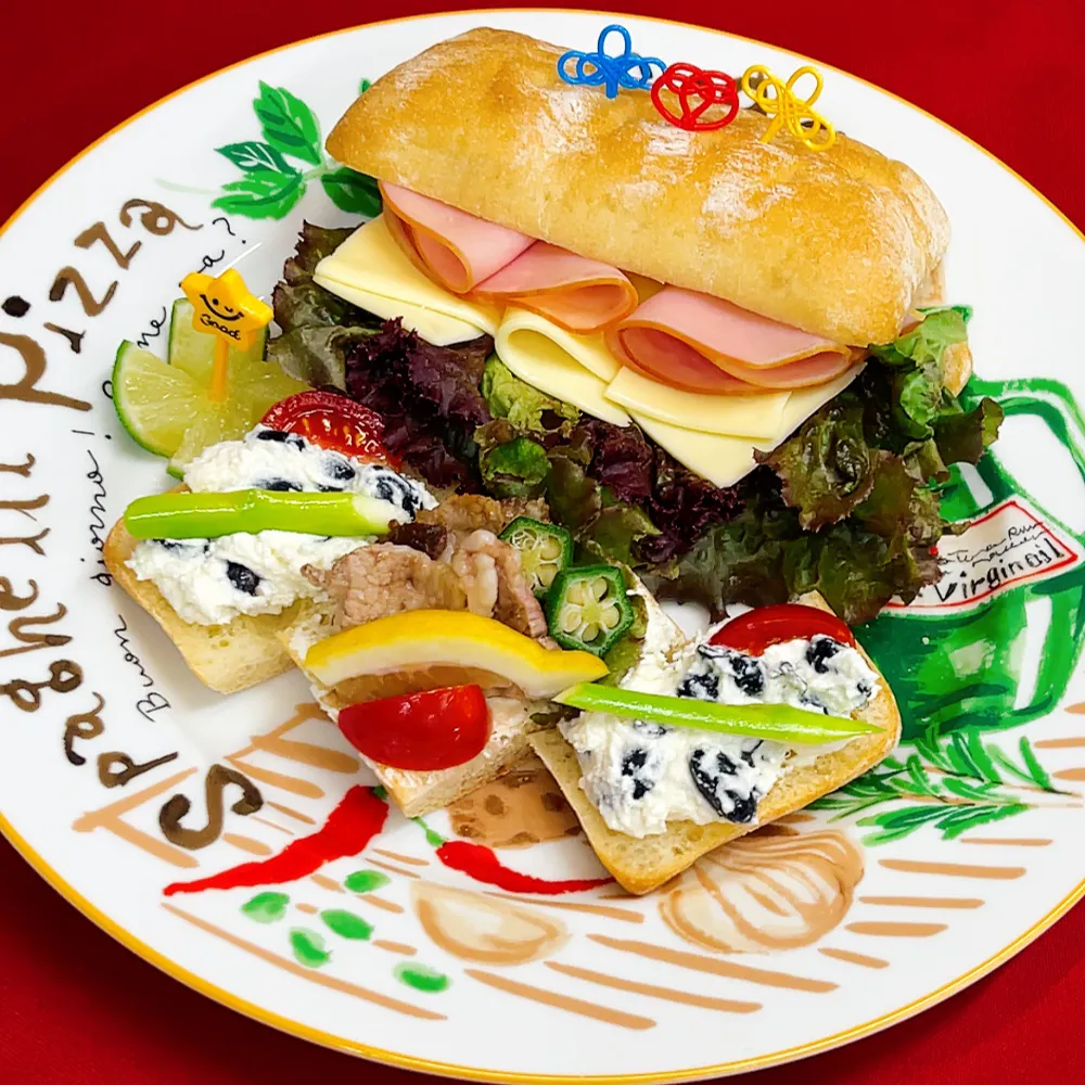 クリームチーズと黒豆を混ぜて塗ったら、アスパラや野菜、焼き肉を乗せたおかずパン。