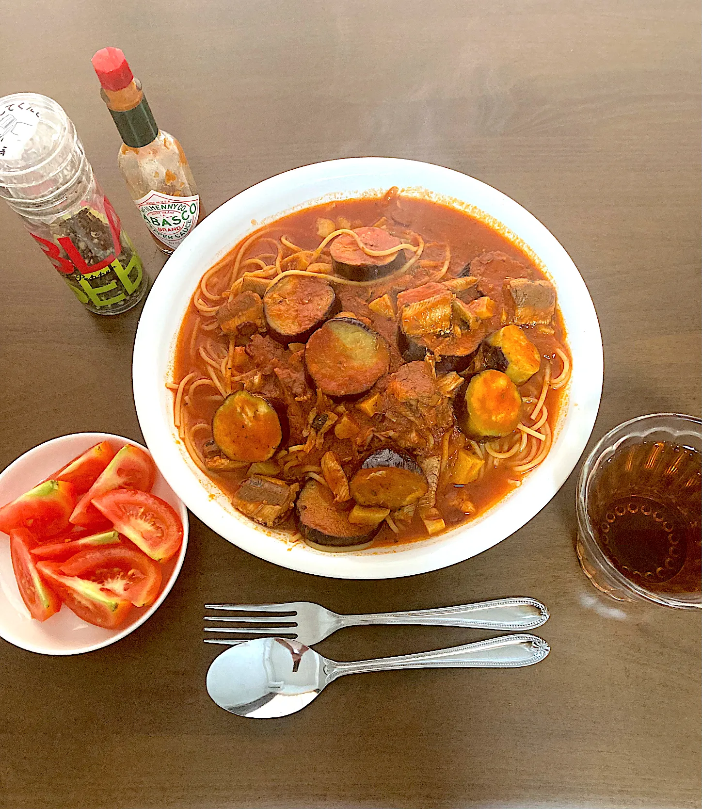にんにくたっぷりイワシ缶と茄子のトマトソーススパゲッティ 今朝、藤沢の家内(はやと)のところから名古屋に戻ってきました。連休中、色々散財したので、しばらくは節約メニューです。今日のメニューも全部冷蔵庫や食品戸棚にあるものだけで作りました。