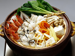 新鮮な海の幸とたっぷりの野菜に、焼き餅を入れたボリュームたっぷりの鍋。身体があたたまります♪
