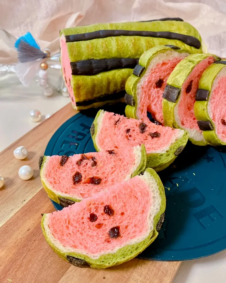 夏だからスイカパン作っている方がいらして、私はラウンド型で作ってみました🍉