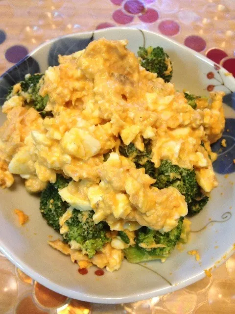 クックパッドID2096518のレシピ。茹でたブロッコリーにゆで卵をつぶしてマヨ、味噌、ツナ、ワサビと和えただけ。ブロッコリー茹で不足でイマイチ(๑•́ ₃ •̀๑)