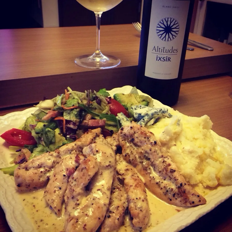 ささみマスタードソース、マッシュポテト、サラダ、ブルーチーズ